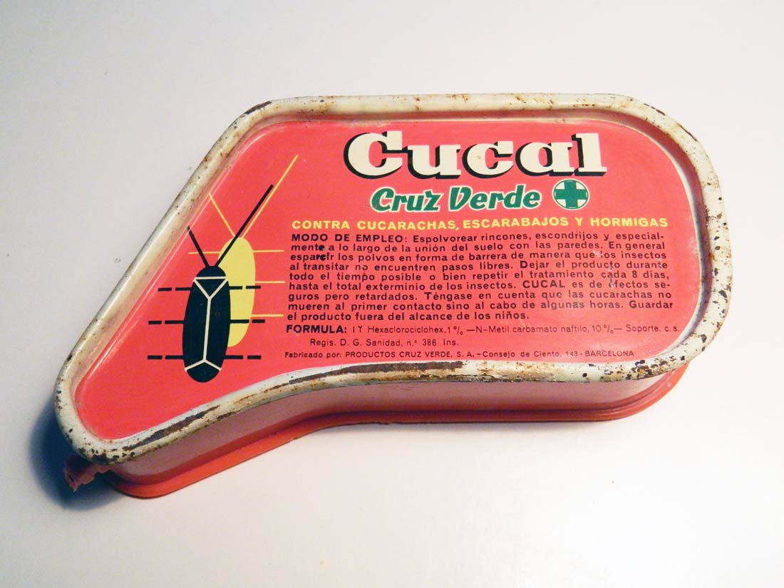 Cucal nació en polvo para espolvoreo, pero con el tiempo aparecieron otras formulaciones bajo el mismo nombre como el envase de gas a presión (espray), en el decenio de 1960, o el cebo en placas, en el decenio de 1990 [3]. Ahora bien, en esta entrada me quiero ceñir a Cucal Polvo, al original. Revisando las hemerotecas de los periódicos, la publicidad de Cucal desaparece a finales del decenio de 1960. Esto sucede con muchos productos insecticidas. Es difícil encontrar publicidad en las siguientes décadas. Y cuando la encuentro, poco dicen de las sustancias activas. Así que tengo que para saber este dato, necesito en encontrar un envase del producto insecticida.