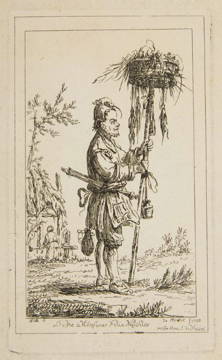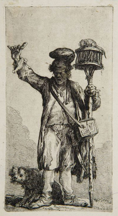 En las tres primeras imágenes se puede ver un objeto que está sujeto del extremo del palo. En la foto 1 y 2, parece que se trata de una especie de jaula en la que pudiera haber ratas. En la foto 3, parece que hay un cesto con paja a modo de nido. Se trata de tres grabados un tanto imaginativos que no sé hasta qué punto reflejaban una realidad. Me baso en ello en el hecho de que los pintores se copian unos a otros. La primera imagen con un cazador de similar apariencia la encontré en un dibujo de Rembrandt de 1632, es decir, a imágenes de cazadores de rata del siglo XVII [1]. Puede que las posteriores imágenes estuvieran muy inspiradas en el maestro holandés. De hecho, el grabado número 2 de Jean-Pierre Norblin de la Gourdaine está inspirado claramente en el grabado número 1 de Christian Wilhelm Ernst Dietrich. O quizás ambos estuvieran inspirados en otro anterior.
