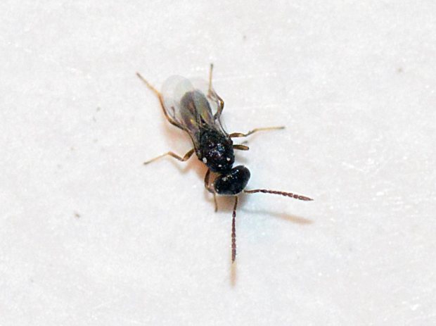 Las fotografías que acompañan a este posteo muestran una avispilla muy parecida a la Anisopteromalus calandrae. Todo apunta hacia ella. No son fotografías de detalle. Por el momento poseo un objetivo macro de precio modesto. No está preparado para hacer fotografías a insectos que apenas hacen 2 milímetros. Para acabar, comentar que esta avispilla pertenece a la familia Pteromalidae (Chalcidoidea).