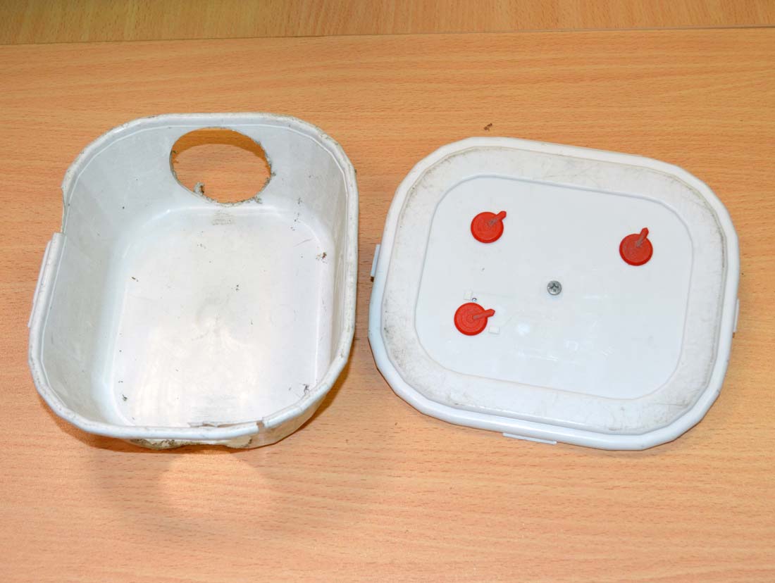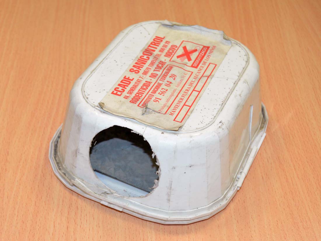 Hace unos días un compañero llevó a la oficina de la empresa en la que trabajo cuatro portacebos bien curiosos. No había visto nada parecido antes. Cogí uno y lo observé con curiosidad. En la parte superior había una etiqueta de papel en la que se podía leer el nombre de Ecade Sanicontrol con sede en la Avenida Generalitat, 7, Torelló. Le di la vuelta al portacebos y me di cuenta de que se trataba de un recipiente para calentar comida en el microondas. Curioso. Habían modificado un recipiente para darle otra utilidad. Pero más curioso era que en la base, es decir, en la tapa del recipiente, había una placa metálica unida mediante un tornillo. La placa metálica parecía dar al portacebos consistencia y peso. Y el tornillo, además de sujetar la placa, serviría para fijar la carga de raticida. Se trata de un portacebos bien original. Un ejemplo de reciclaje.