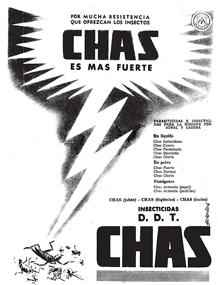 En la imagen número 4 se puede ver un anuncio de la marca Chas. En este se puede leer una lista de 10 productos insecticidas con el mismo nombre. Unos están formulados para pulverizar, otros para espolvorear y también los hay para realizar una fumigación. A parte de estos productos, hubo otros bajo la misma marca. Destaco dos: el Super Chas Perfumado, comercializado durante la década de 1960, y Chas Loción contra mosquitos. No sé hasta cuándo se mantuvo Chas como marca de productos domésticos. A finales de la década de 1970, Abonos Medem pasó a denominarse Agrocrós y se centró en el ámbito agrícola. Años más tarde Agrocrós se transformó en Cheminova Agro y cambiaron de manos todos sus activos, entre los cuales la marca Chas.