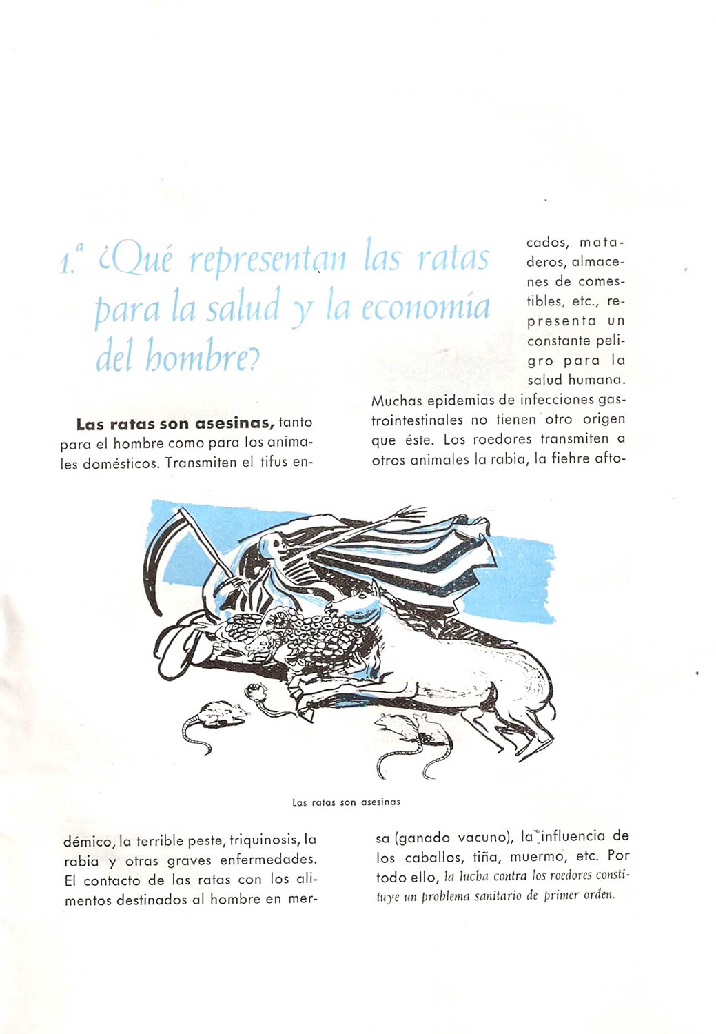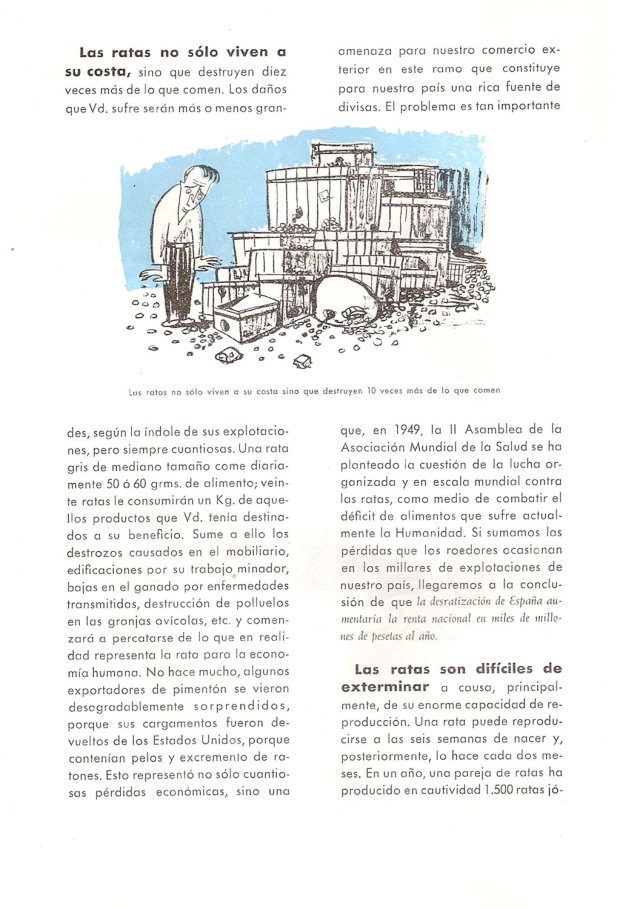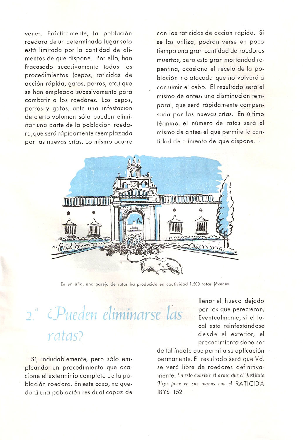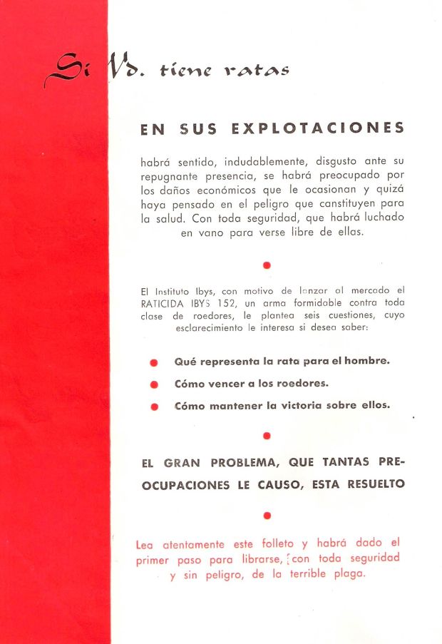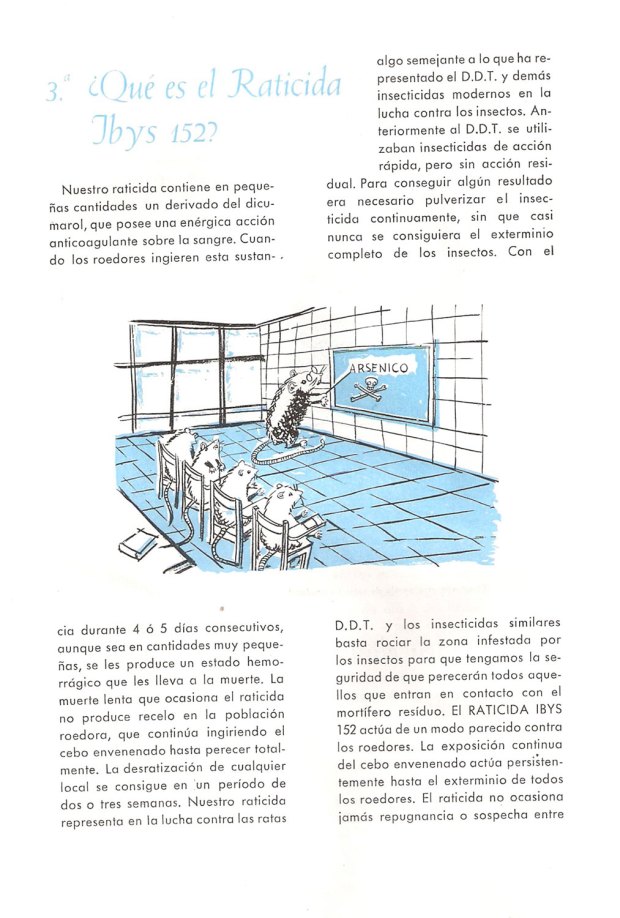 Ha llegado a mis manos un documento muy interesante. Se trata de un folleto publicitario formado por 16 páginas para promoción del Raticida IBYS 152 [1]. Este documento fue editado en 1953, un año después de que este producto raticida a base de warfarina fuera puesto en el mercado por el Instituto IBYS. Este producto pronto tuvo éxito y llevó a la creación de una división de aplicaciones de desratización que llevó a cabo las más importantes campañas de lucha contra múridos en las décadas de 1950 y 1960 [2].