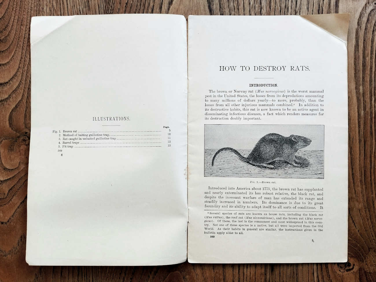 Este opúsculo de carácter práctico se centra totalmente en los medios de control de ratas. En la imagen número 3, se puede ver el índice de la obra. Dedica muy poco espacio, una página y media, en la descripción de las ratas. De hecho, solo en la rata de alcantarilla (Rattus norvegicus) como el animal dañino a combatir. La primera frase es clara: » The brown or Norway rat (Mus norvegicus) is the worst mammal pest in the United States, the losses from its depredations amounting to many millions of dollars yearly – to more, probably, than the losses from all other injurious mammals combined». Con estos otros mamíferos perjudiciales se refiere también a la rata negra (Rattus rattus) que en aquella época tenían sus dos principales morfotipos como dos especies diferentes. David E. Lantz cita como black rat (Mus rattus) y como roof rat (Mus alexandrinus). Respecto a la rata de alcantarilla dice que fue introducida en 1775 en Estados Unidos. Por lo que al poco tiempo después de entrar en Europa, saltó el Atlántico.