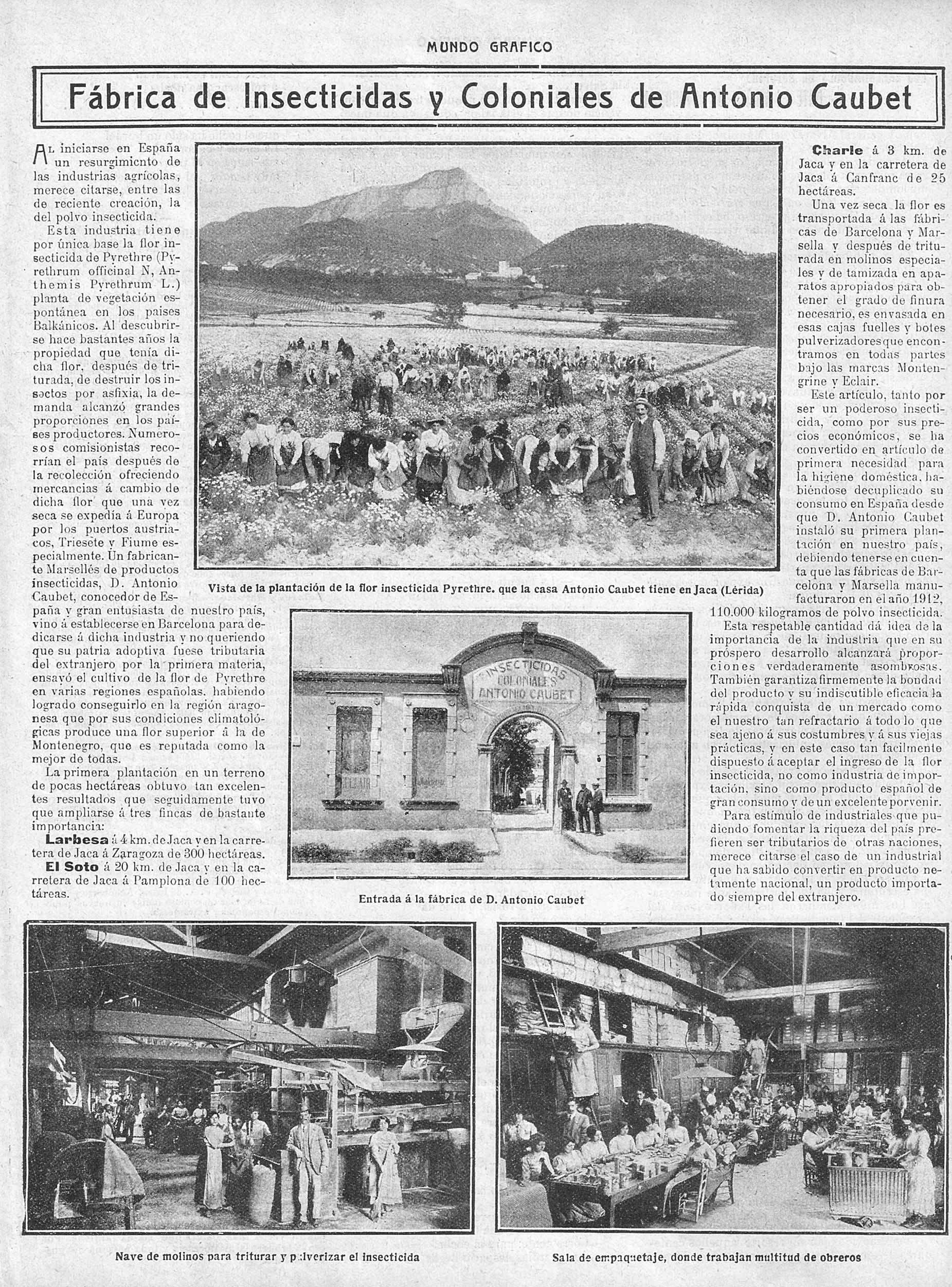 Dedico esta entrada a un artículo sobre Antonio Caubet, industrial francés que estableció fábrica de insecticidas en Barcelona y cultivó pelitre en Jaca, Huesca [1]. La importancia del negocio emprendido por Caubet llevó a que le dedicaran un espacio en el semanario Mundo Gráfico, destacada revista ilustrada de la época publicada en Madrid entre 1911 y 1938 [2]. En la imagen número 2, se puede ver una copia de la página dedicada a Caubet en la edición del 30 de julio de 1913. Transcribo el contenido respetando la ortografía de la época: