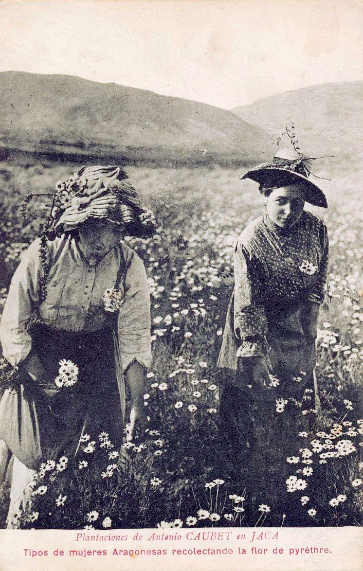 »»Esta industria tiene por única base la flor insecticida de Pyrethre (Pyrethrum officinal N, Anthemis Pyrethrum L.) planta de vegetación espontánea en los paises Balkánicos. Al descubrirse hace bastantes años la propiedad que tenía dicha flor, después de triturada, de destruir los insectos por asfixia, la demanda alcanzó grandes proporciones en los países productores. Numerosos comisionistas recorrían el país después de la recolección ofreciendo mercancias á cambio de dicha flor que una vez seca se expedía á Europa por los puertos austriacos, Triesete y Fiume especialmente. Un fabricante Marsellés de productos insecticidas, D. Antonio Caubet, conocedor de España y gran entusiasta de nuestro país, vino á establecerse en Barcelona para dedicarse á dicha industria y no queriendo que su patria adoptiva fuese tributaria del extranjero por la primera materia, ensayó el cultivo de la flor de Pyrethre en varias regiones españolas, habiendo logrado conseguirlo en la región aragonesa que por sus condiciones climatológicas produce una flor superior á la de Montenegro, que es reputada como la mejor de todas.