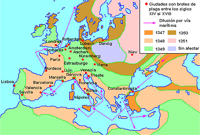 Voy a dedicar este posteo a un tema que considero apasionante. Se trata de la pandemia que afectó a Europa a partir de 1347 y que recibió el certero nombre de Peste Negra. Está considerada como la epidemia más mortífera que haya sufrido la Humanidad. Su mortalidad estuvo entre el 10 y el 60%. Esta cifra varió con las sucesivas oleadas que hubo. Las primeras fueron devastadoras llegando a eliminar más de la mitad de la población. Las sucesivas fueron más benignas debido la resistencia generada en los supervivientes. La Peste Negra estuvo asolando Europa por espacio de tres siglos hasta que desapareció.