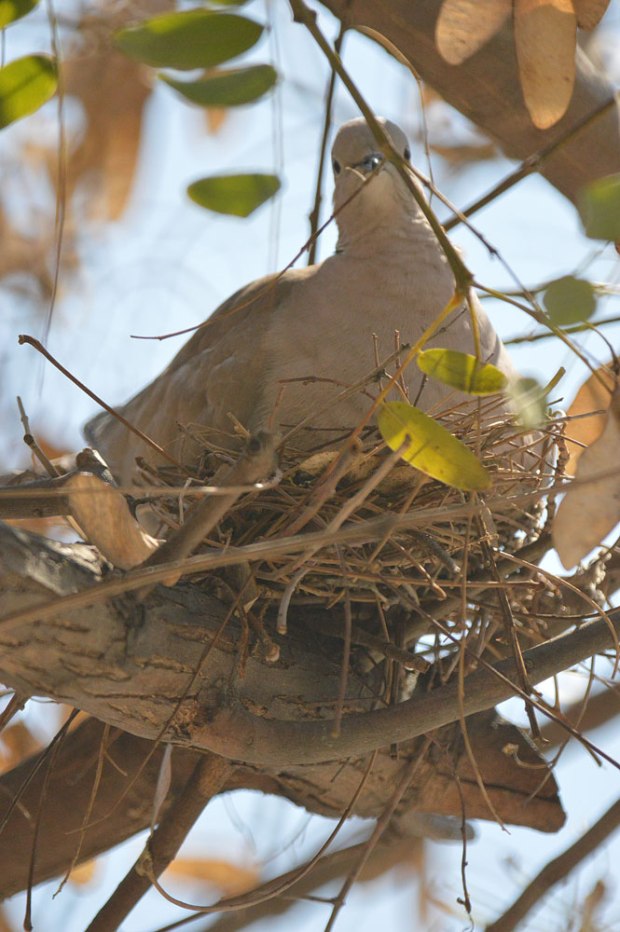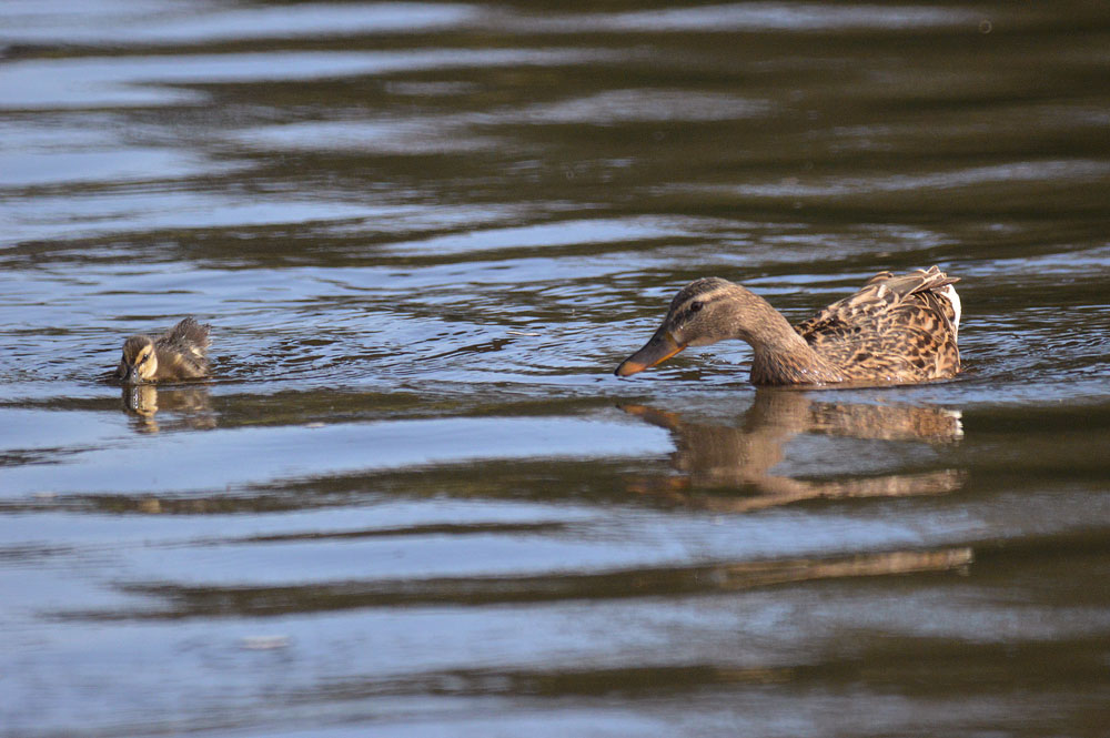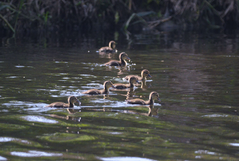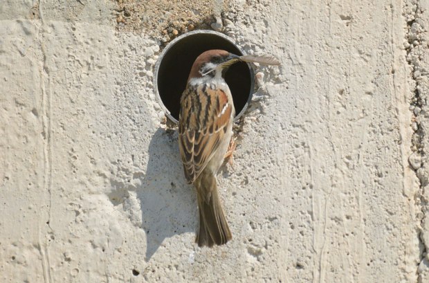 Este fin de semana he hecho algunas fotografías de varias especies de aves en diferentes estadios de la época de cría. En las tres primeras imágenes, se pueden ver polluelos de ánade real (Anas platyrhynchos). Nacieron el pasado mes de marzo. Es una escena enternecedora verlos nadar junto a sus padres. Estos pueden tirar adelante hasta 12 polluelos. En las imágenes 4 y 5, se puede ver a una tórtola turca (Streptopelia decaocto) incubando los huevos. Las tórtolas construyen un nido pequeño sobre un árbol. Este no da más que para un par de huevos. En la imagen número 6, se puede ver un gorrión molinero (Passer montanus) con una pluma en el pico que utilizará para construir el nido. Como se ve, aprovecha los mechinales en paredes de la misma manera que el gorrión común (Passer domesticus). De esta manera se protegen frente a depredadores.