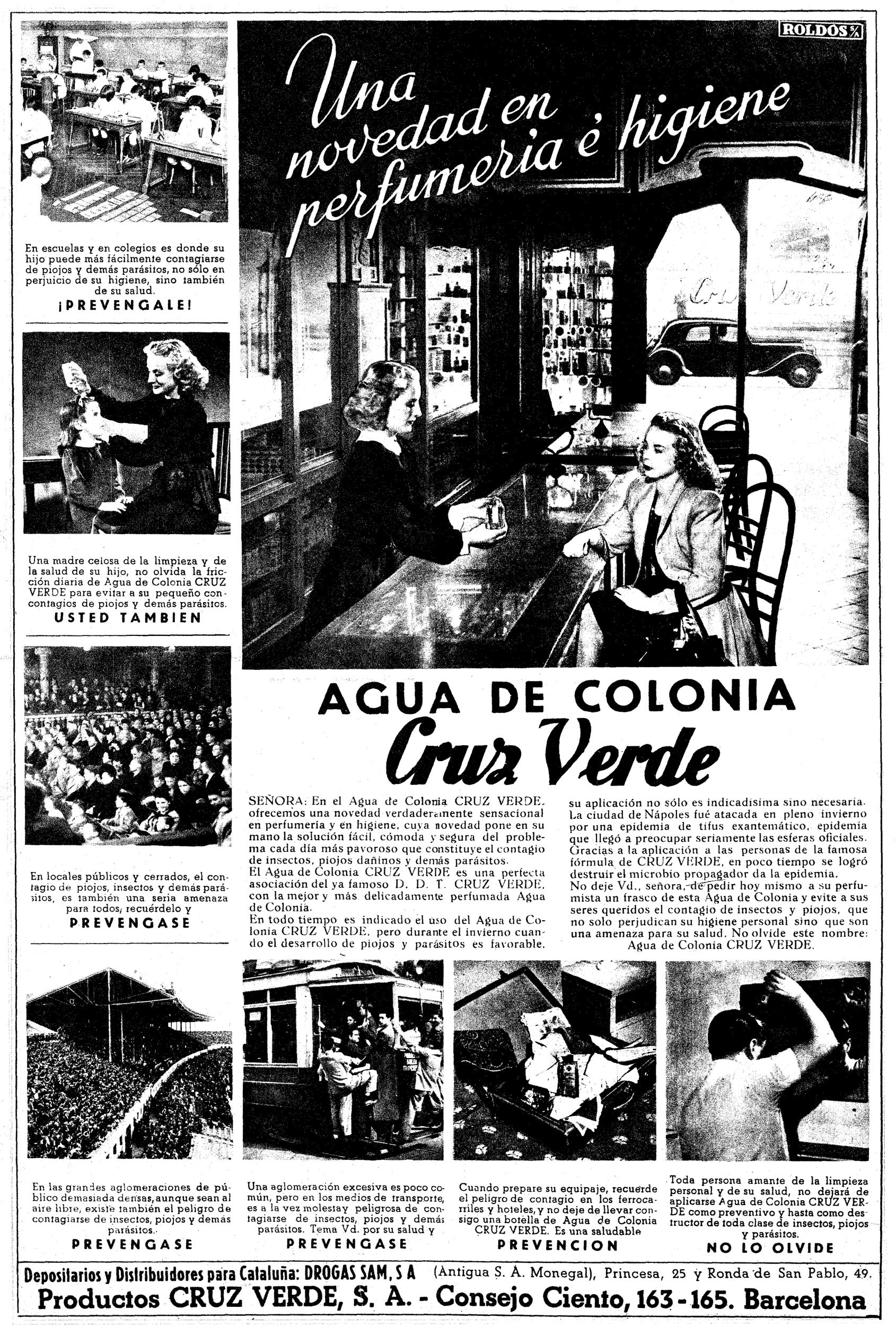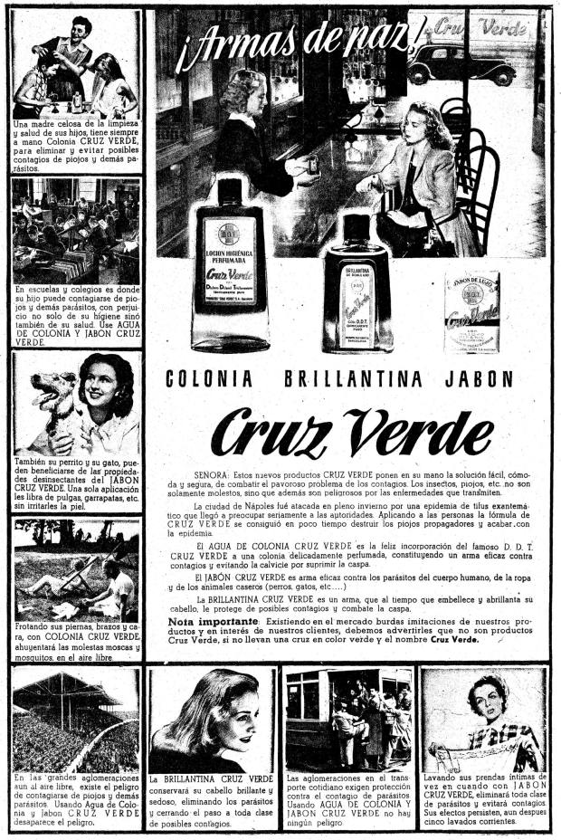 Cruz Verde fue una empresa pionera en el desarrollo y comercialización de productos insecticidas en España. Tenía una gama de antiparasitarios comercializados a partir de 1945 que tuvieron mucho éxito (figura 2). Estaban formulados a base de DDT, lo cual garantizaba que al aplicarlo sobre la ropa y el cuerpo eliminara todo artrópodo parásito como ladillas, piojos y pulgas. Entre la gama de antiparasitarios de Cruz Verde, estaba el jabón, la brillantina y la loción (figura 3). El de más éxito fue la loción higiénica que, entre muchos usos que tenía, era el de ahuyentar mosquitos.