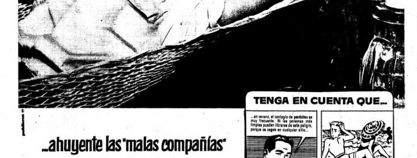 En la imagen número 4, se puede ver un anuncio de la loción de Cruz Verde de agosto de 1956. Este incorpora una fotografía de un hombre durmiendo plácidamente una siesta en una hamaca. Este hombre puede tener un placentero descanso gracias a haberse frotado con la Colonia Cruz Verde que le protege contra moscas y mosquitos. Aquí se observa un cambio de enfoque en los productos antiparasitarios. Ahora no solo se trata de eliminar los ectoparásitos, sino que se busca ahuyentar a cualquier insecto que pueda incomodar. Desconozco qué sustancia ahuyentadora llevaba la colonia que «elimina y evita el contagio de parásitos».