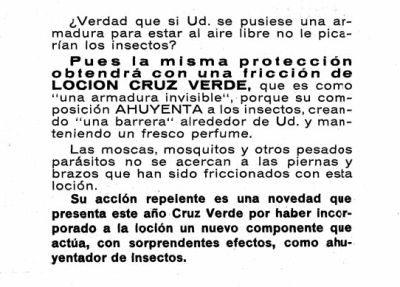 En la imagen número 5, se puede ver un anuncio parecido al anterior, pero de un año después, de agosto de 1957. Se publicitaba la Loción Cruz Verde como nueva. En el anuncio se ve a un señor descansando en una tumbona vestido con una armadura. Mediante una fricción se obtiene la protección de «una armadura invisible». El producto se presenta como «nueva loción Cruz Verde de acción repelente». La armadura es una metáfora de lo que es capaz de hacer la nueva formulación. En adelante, en los anuncios de este producto aparecerá la palabra repelente, la cual nunca se había usado. Hasta entonces, la Loción Cruz Verde ahuyentaba, pero no repelía.