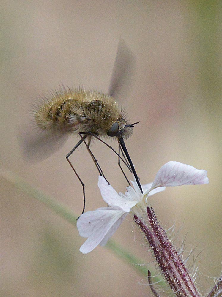 Al acercarse a la flor, introducían su larga trompa en su interior. Es interesante ver como se especializa un insecto en sacar partido al medio en el que vive. El insecto se ha adaptado a la flor y la flor al insecto. De esta adaptación ambos sacan partido. Uno se alimenta y el otro tiene su insecto especializado que la poliniza. No puedo decir qué especie de Bombylius es la de las fotos. Puede que se trate de Bombylius minor. A mí me pareció que no medían más de 1 centímetro de largo.