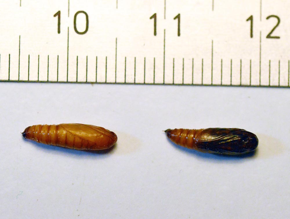 Hace cosa de 6 meses me encontré en un sótano un grata sorpresa. Andaba yo haciendo una desratización cuando topé con un viejo paquete de cartón de Raticida IBYS 152-S [1]. Tenía número de registro 1771-RAT de la DGFPS. Estaba en una esquina y en mal estado. El paquete estaba abierto y la bolsa que contenía el producto estaba rota. Dentro había raticida granulado en forma de pellets de color rosa. Al sacar la bolsa vi que el granulado estaba compactado formando grumos. Busqué entre el producto y aparecieron unas larvas de color oscuro. Estas habían tejido sedas para ligar el granulado. En la imagen 1, se puede ver la forma y color de las larvas. Picado por la curiosidad, cogí una muestra de larvas y granulado. En mi casa, puse la muestra en una estantería a la espera de que las larvas se transformaran en mariposas para poder hacer la identificación.