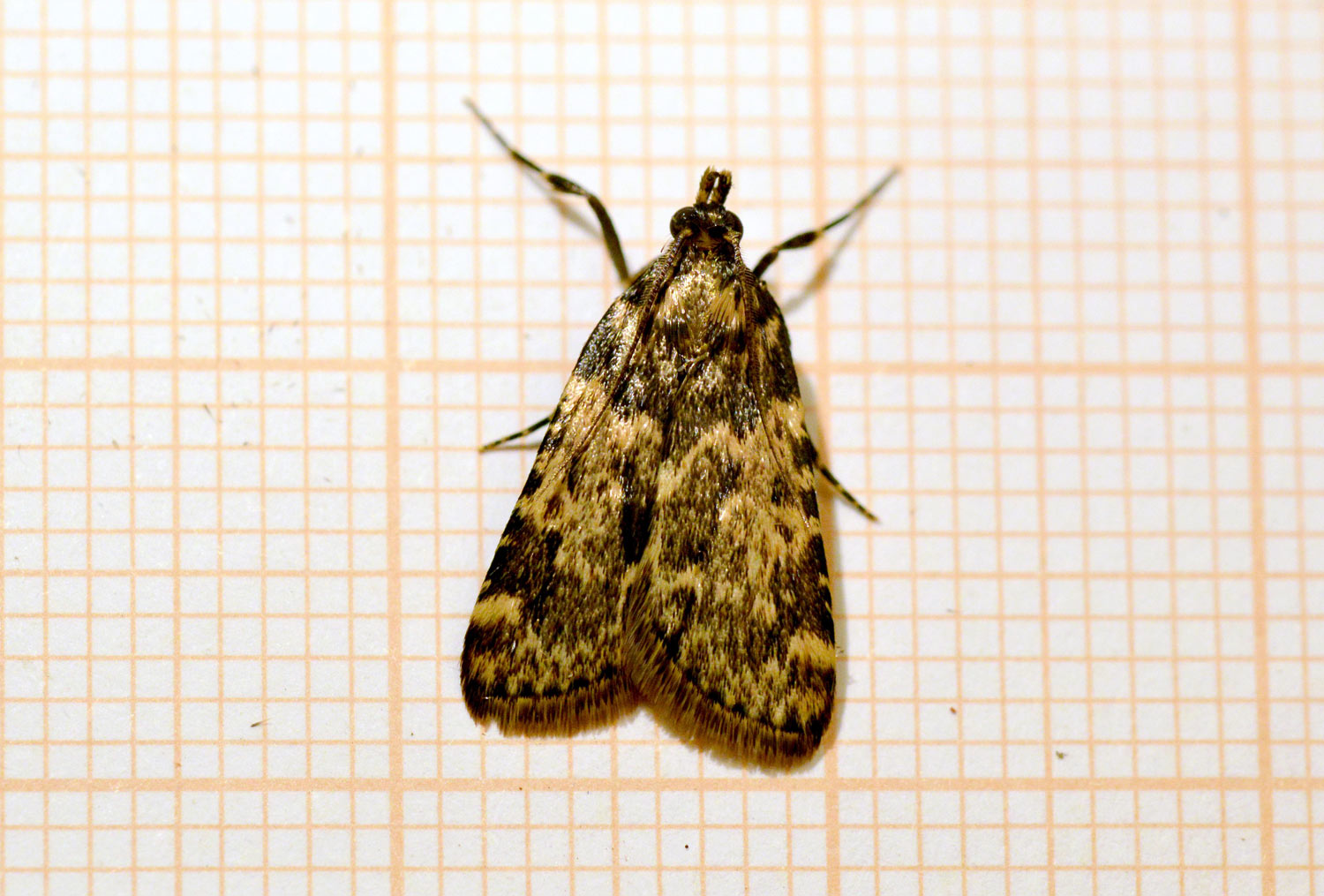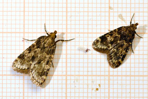 Hace dos semanas observé la primera mariposa. Vi que tenía forma de pirálido (Pyralidae). Tras un rato de búsqueda, di con la especie. Esta era Aglossa caprealis, conocida vulgarmente como polilla de los granos almacenados. En las imágenes 3 y 4 se puede ver un adulto de esta especie. Como otros pirálidos, puede alimentarse de diversos productos. Las hembras depositan los huevos de color blanco sobre la comida de la que se alimentarán las larvas. Entre su variada dieta hay productos almacenados a base de granos, plantas secas o estiércol. Se la puede clasificar como una especie detritívora. También pueden reproducirse sobre materia de origen animal. Es por tanto un insecto necrófago que participa en la descomposición de los cadáveres. Otro pirálido con una dieta también amplia es Pyralis farinalis, conocido como polilla parda de la harina [2].