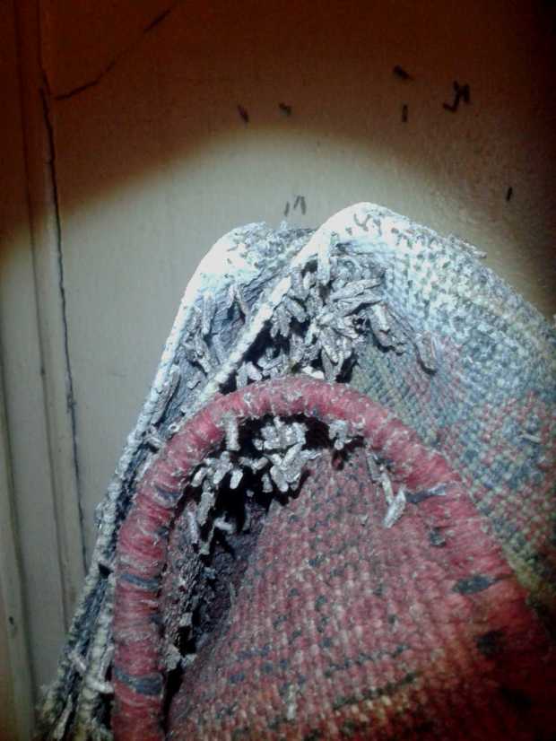 Fig 5. Alfombra afectada por polilla portaestuche de la ropa (Tinea pellionella)./ C. Pradera 05-2014