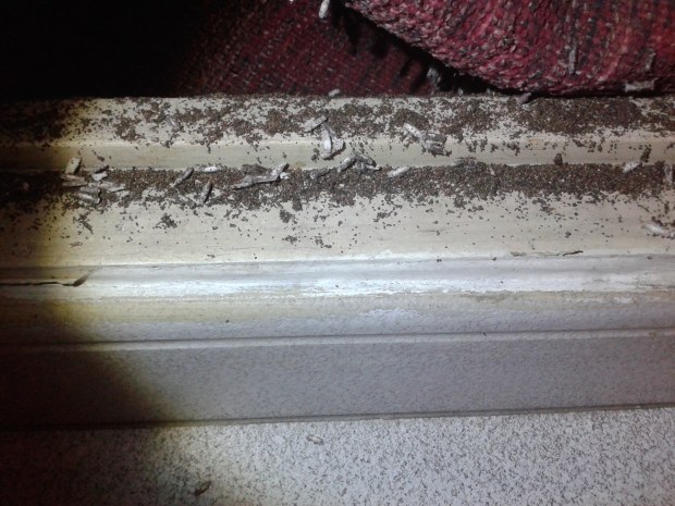 Al levantar la alfombra, encontré el suelo lleno de estuches y excrementos (figura 6). Las polillas debían llevar un par de años, por lo menos, desarrollándose a base de una vieja alfombra sin uso. Las paredes y puertas del armario estaban llenas de estuches. Es curioso ver cómo los estuches forman agrupaciones. Parece que a las larvas les guste ponerse donde otras larvas han fijado su estuche. Aproveché la ocasión para llevarme larvas y adultos para fotografiar y poder ilustrar esta entrada.