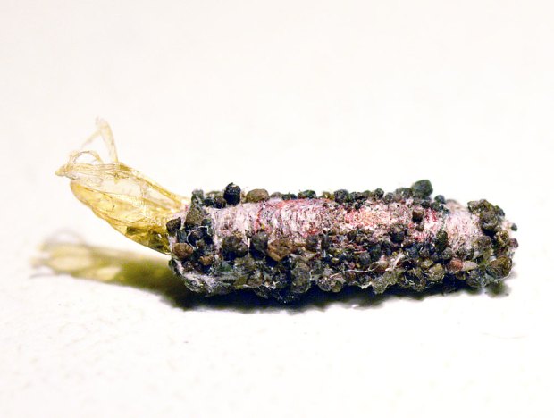 Fig 6. Estuches de larva de polilla portaestuche de la ropa (Tinea pellionella)./ C. Pradera 05-2014