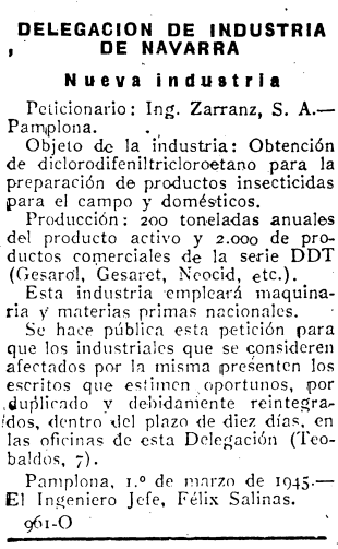 Desconozco cuándo INQUINASA empezó a fabricar DDT para Geigy. He encontrado un anuncio oficial en el Boletín Oficial del Estado (BOE, 12 de marzo de 1945, núm. 71, pág. 846) donde se aprueba una solicitud para la creación de una fábrica para la «obtención de diclorodifeniltricloroetano para la preparación de productos insecticidas, para el campo y domésticos» (figura 4). La producción será de «200 toneladas anuales del producto activo y 2.000 de productos comerciales de la serie DDT (Gesarol, Gesaret, Neocid, etc.).» El peticionario es «Ing. Zarranz SA de Pamplona».