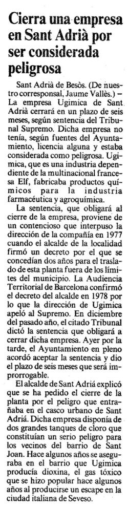 Pasemos a Industrial Química Moderna SA de Sant Adrià del Besòs, en Barcelona, de la cual tengo pocos datos. La fábrica estaba situada en la Avenida de la Playa (antigua Avenida de la Victoria). En esta zona antiguamente había mucha industria, ya que estaba situada cerca de las vías de ferrocarril que unían Barcelona con Mataró y había una importante planta térmica de producción de electricidad. No sé cuándo empezó su actividad. Sin embargo, sí sé cuándo las finalizó. En un artículo publicado en La Vanguardia en enero de 1986 (figura 7), se explica que cesará su actividad en seis meses. En aquel año era llamada Ugimica. Industrial Química Moderna pasó en 1967 a manos de la compañía Ugine Química de Halógenos (figura 4), filial española de Ugine-Kuhlmann. Según se explica en el artículo la empresa carecía de licencia de actividad y era considerada peligrosa por lo que en 1977 el alcalde de la localidad firmó un decreto para que en dos años cambiara su ubicación. Esto llevó a un contencioso en los tribunales que finalizó en 1986 y obligó a la empresa a cerrar.