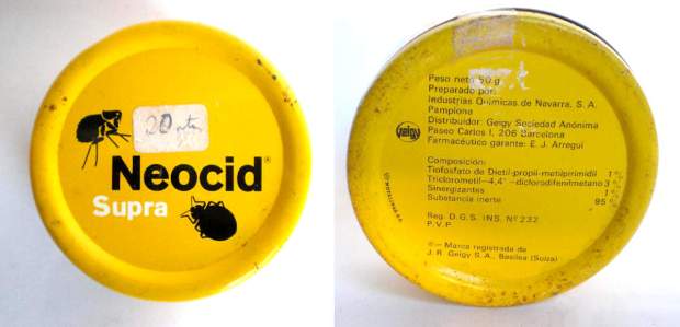 En INQUINASA se elaboró toda la gama de productos con DDT de Geigy. No solo los de uso agrícola (GESAROL, GEIGY 33, GESAFID, GESAREX), sino también los de higiene personal (NEOCID, CAM). En la imagen número 2 se puede ver la parte inferior de un envase de NEOCID donde se lee el nombre de Industrias Químicas de Navarra. El DDT está formulado al 3% y aparece como «triclorometil-4,4′-diclorodifenilmetano». En la planta también se elaboraron otros productos plaguicidas de Geigy como el raticida TOMORIN, elaborado con cumacloro, anticoagulante de primera generación desarrollado por la misma Geigy. Y también se elaboraron insecticidas formulados con diazinón, materia activa organofosforada descubierta por Geigy en 1952 (figura 3).