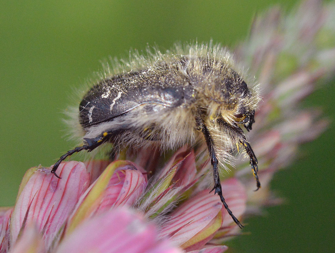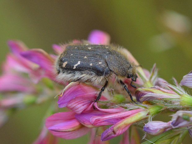 Cuando llegan los calores es fácil ver al escarabajo de las flores (Tropinota squalida). Como su nombre indica, es fácil verlo sobre flores. Se parece al escarabajo del sudario (Oxythyrea funesta) [1]. Ambos son parecidos en forma y tamaño, y tienen un comportamiento similar. Ambas especies son oscuros, peludos, redondeados y miden 1 centímetro de largo aproximadamente. Para diferenciarlos podemos atender a las manchas blancas que tienen en la parte superior. El escarabajo del sudario tiene 6 manchas blancas sobre el pronoto que no tiene el escarabajo de las flores.