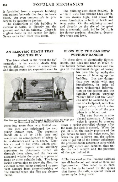 Según la Wikipedia, la primera constancia que se tiene sobre un insectocutor de parrilla de electrodos es una nota aparecida en la revista norteamericana Popular Mechanics de octubre de 1911 (figura 1). Esta nota va acompañada de una imagen del aparato. Como se puede ver, parece bien diseñado. He estado buscando patentes sobre este aparato, pero no he encontrado ninguna por el momento. Parece ser que no pasó del mero prototipo. No sabemos nada de sus inventores más que se trataba de dos jóvenes de Denver. Este aparato contiene lámparas, pero la función de estas no es la de atraer a las moscas. Lo que las atrae es un cebo a base de carne o cualquier otra cosa que se depositaría en el cajón. La luz que está en interior de la parrilla de electrodos serviría para ayudar a retirar las moscas. Y las del exterior, para proteger el aparato de un posible cortocircuito.