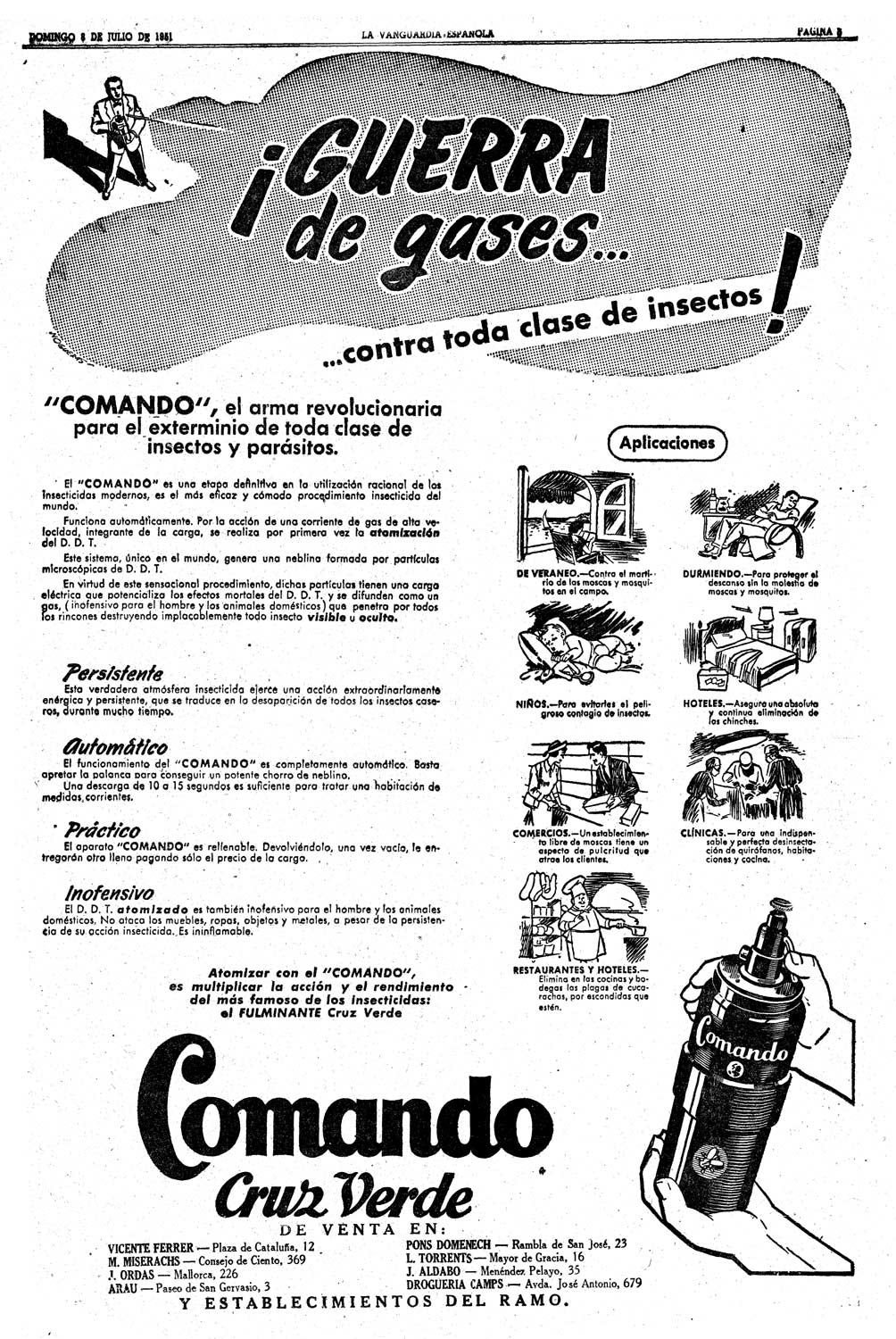 He encontrado un producto que desconocía. Se trata del insecticida en envase de gas a presión para uso doméstico llamado Comando. El primer anuncio que he encontrado fue publicado en el periódico La Vanguardia el jueves 27 de julio de 1950 (figura 1). Como empresa comercializadora aparece Aerosol SA. Un año después, en 1951, aparecieron más anuncios a lo largo del verano. El primero de ese año fue publicado el domingo 8 de julio (figura 2). Como se puede ver, la comercializadora ya no es Aerosol, sino Cruz Verde SA.