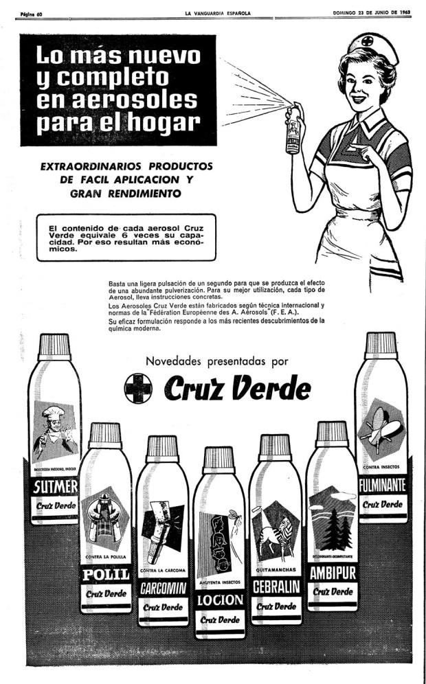 Comando fue un producto pionero, aunque no fue hasta diez años después cuando los botes de aerosol tuvieron éxito entre el público. Es a finales de la década de 1950 que empieza a despegar este mercado. Y a partir de principios de la siguiente década, los fabricantes empiezan a formular sus marcas en botes de gas a presión. En un anuncio de Polil de 1962 (figura 3), podemos ver que Cruz Verde ya vendía en ese año sus insecticidas en bote de aerosol. Hoy en día, si pensamos en cualquier marca de insecticida doméstico, nos viene a la cabeza la imagen de un envase metálico cilíndrico. Pero para llegar hasta este envase hubo una evolución. Voy a aprovechar esta entrada para anotar algunos datos sobre esta evolución.