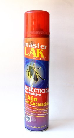 Fui a hacer una copia de unas llaves a la ferretería. Y mientras esperaba que hicieran las copias, vi sobre el mostrador un bote de Masterlak Hogar [1]. Para pasar el rato me puse a leer la etiqueta y me encontré con esto: «1 año sin insectos.» No me sorprendió. Este no es el único insecticida de uso doméstico que usa tan atrevido reclamo para ofrecerse al público. El año pasado dediqué un posteo a la laca insecticida Zum de Quimiopen [2]. Lo sorprendente del caso es que debajo de la frase, se explica que no son 12 los meses sin insectos allá donde se aplique Masterlak Hogar, sino 13. Vaya. Yo diría que este producto supera en eficacia al mismo DDT. Esto es lo que se puede leer: «Estudios científicos demuestran que UNA SOLA APLICACIÓN elimina DURANTE 13 MESES el 100% de las cucarachas».