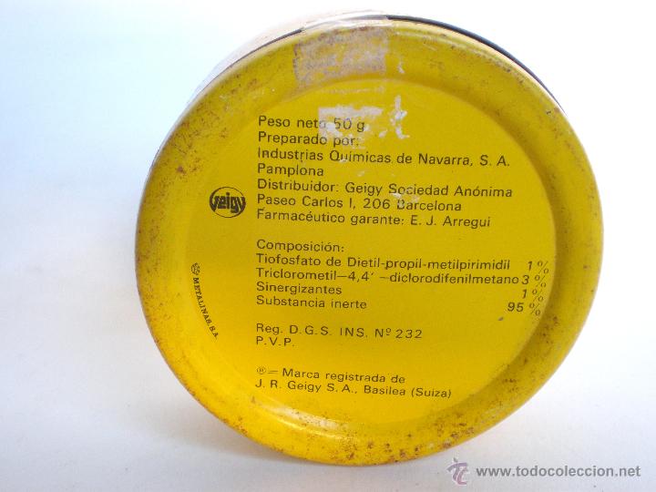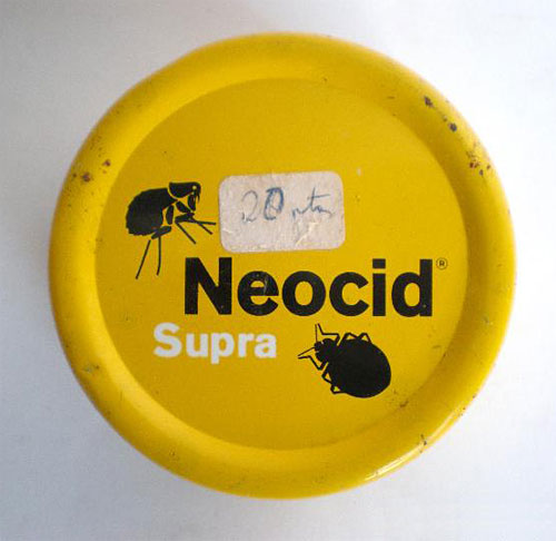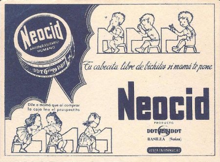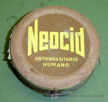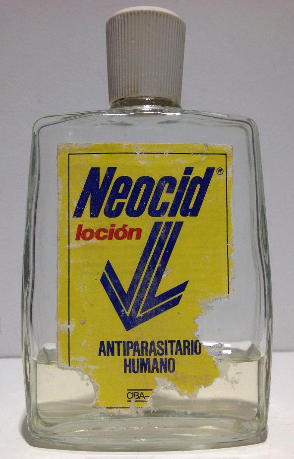 En la imagen número 1 y 4, se puede ver la forma del envase original de Neocid. Se trata de una evolución de la caja fuelle con el que tradicionalmente se vendían los polvos insecticidas de uso doméstico. Es una caja de cartón con una pequeña abertura en un lateral. Al presionar el envas, salía el polvo a presión. Estaba formulado en polvo para uso externo sobre el cuerpo, ya fuera espolvoreo sobre cabello o cuerpo. Debía de contener unos 50 gramos de producto. También fue vendido en formulado líquido. Aunque no he encontrado ninguna imagen de una botella de la época. Pero sí una de Neocid Loción que puedo fechar como posterior a 1971 (figura 5). Este producto también estaba formulado con DDT. En este año Geigy se unió a la compañía Ciba para formar la importante compañía química Ciba-Geigy.