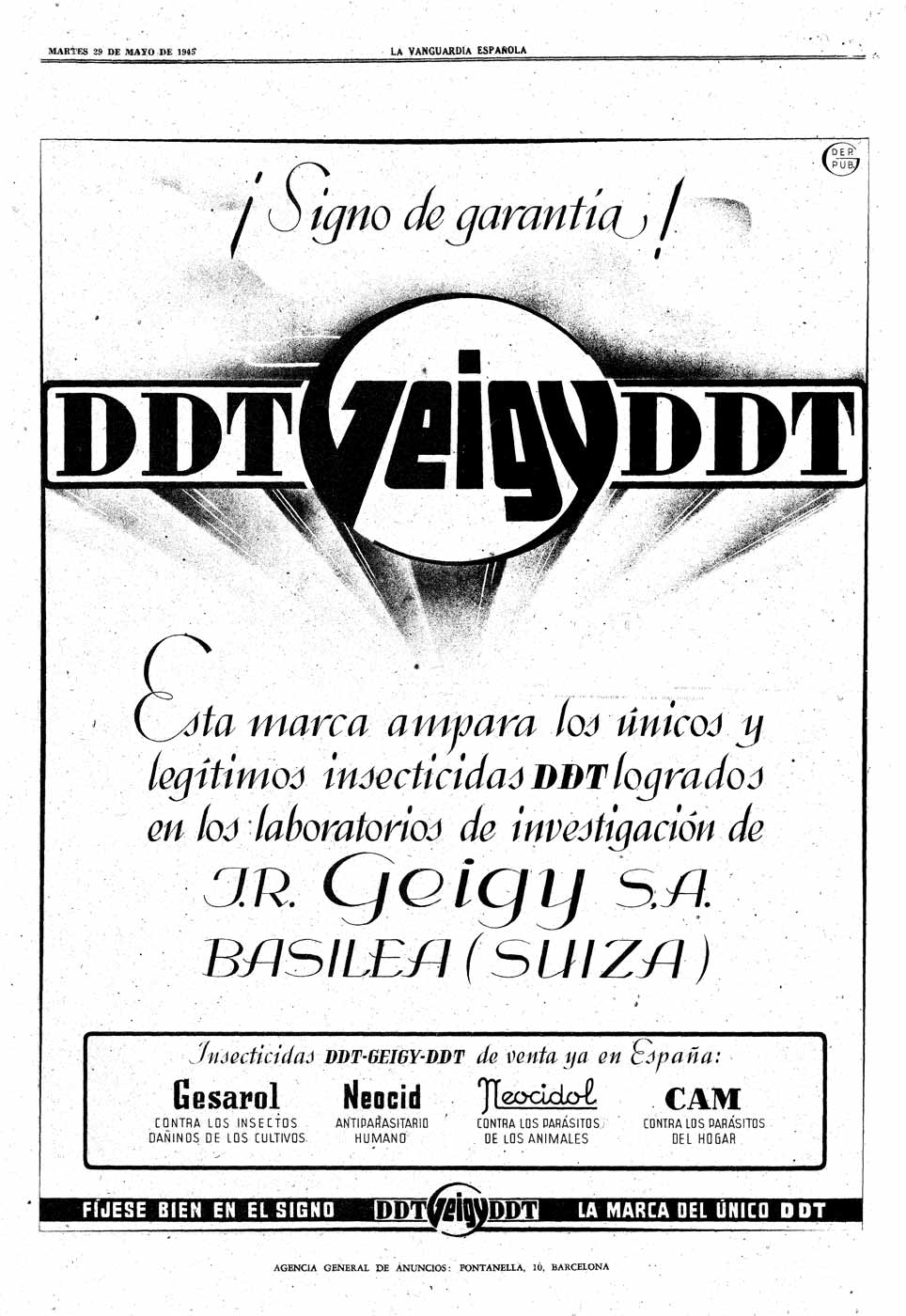 El antiparasitario Neocid llegó a España en 1945. El primer anuncio que he encontrado prensa escrita es de mayo de ese año (figura 3). Junto a Neocid, aparecen otras tres marcas de Geigy como Gesarol, Neocidol y Cam. Respecto a estas dos últimas marcas, Neocidol sirvió para la comercialización de antiparasitarios en veterinaria y Cam para control de plagas domésticas.