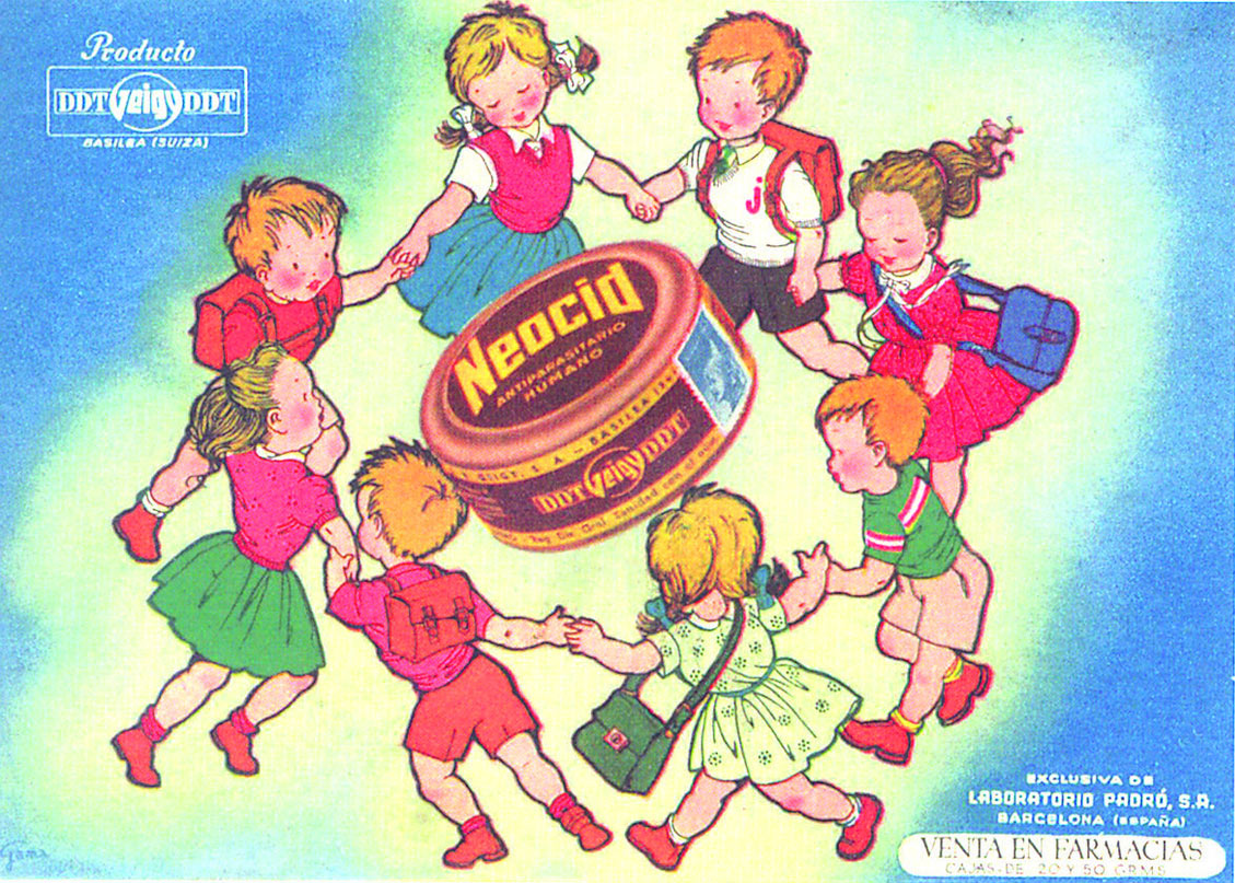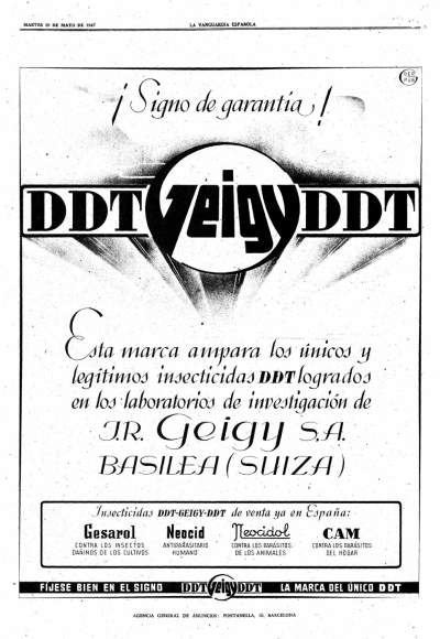 Cuando el doctor Paul Müller de la casa J.R. Geigy descubrió las propiedades insecticidas del DDT, las primeras aplicaciones prácticas fueron para en plantas de cultivo. Se experimentó su poder letal sobre insectos perjudiciales para los campos. La primera marca con DDT fue el Gesarol. Su primer éxito fue cuando se aplicó en 1941 para combatir al escarabajo de la patata (Leptinotarsa decemlineata) en el agro suizo. Sin embargo, desde un punto de vista sanitario, la gran aplicación fue mantener a raya piojos, pulgas y mosquitos, lo cual ayudó a salvar las vidas de muchas personas [1]. Parece ser que los experimentos con piojos y pulgas se llevaron a cabo en el invierno de 1941-42 por el doctor Domenjoz [2]. El éxito llevó a la creación de la marca Neocid, la cual se puso pronto a disposición del ejército suizo. Y luego, del ejército aliado.