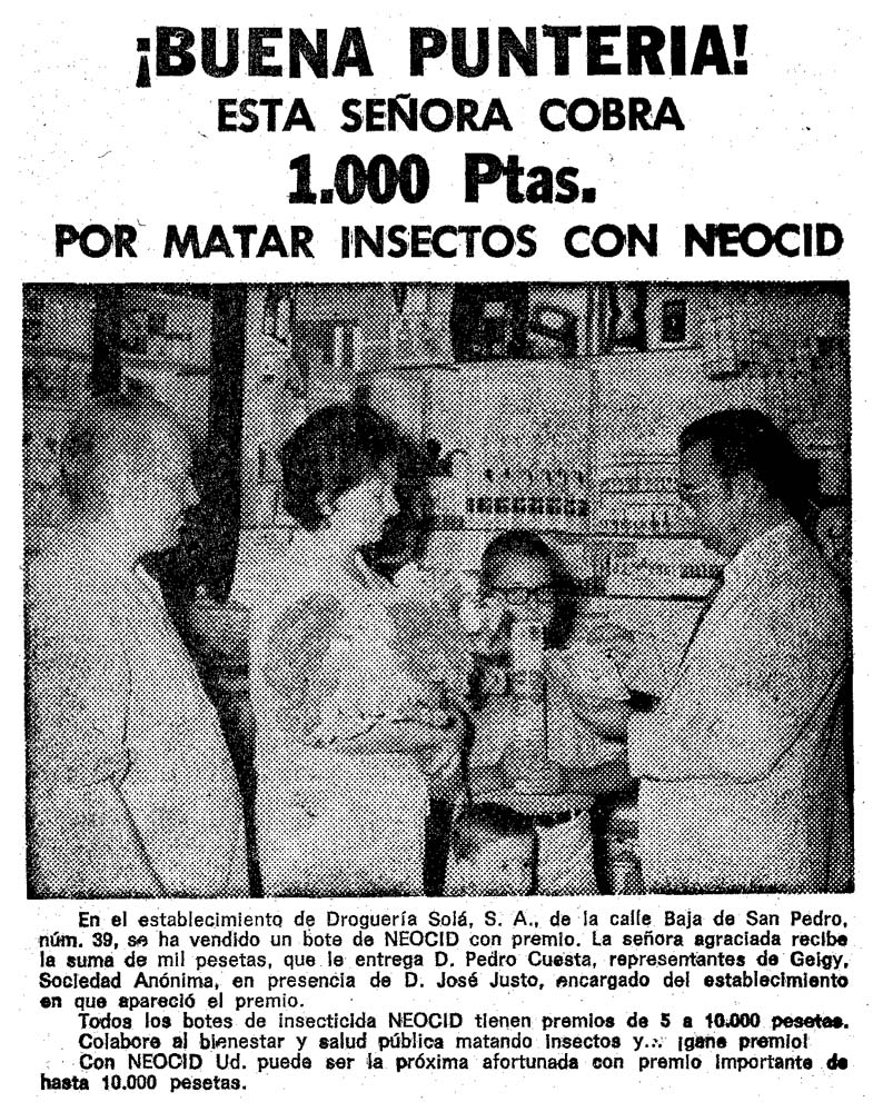 La marca Neocid fue muy reconocida por el público. Es por ello que Geigy aprovechó su implantación en el mercado para ofrecer otros productos. Uno de ellos fue Neocid Supra (figuras 6-7), el cual estaba pensado para pulgas, chinches e insectos rastreros. Fue comercializado en la década de 1960. También de esta época es Neocid Aerosol. En la imagen número 8, se puede ver el envase en la portada de un disco single promocional. Podemos leer que como estrategia de ventas se indica que comprando un bote se puede obtener un premio. Según parece, estos premios eran en metálico de entre 5 a 10.000 pesetas. Para dar fe de ello, se insertó en los periódicos imágenes de los ganadores del premio. En la figura 9, se puede ver un recorte del año 1970 donde aparece una fotografía en la que una agraciada recibe 5.000 pesetas de la mano de un representante de Geigy.
