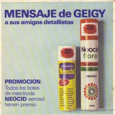 Estas marcas acaparaban la mitad del mercado de insecticidas domésticos. La otra mitad estaba en manos de otras marcas de las mismas casas comerciales o de otras empresas. Lo que sí tengo claro es que, a principios de la década de 1990, Neocid ya no estaba presente en el mercado. Quizás Ciba-Geigy abandonó la línea de insecticidas domésticos. Sin embargo sí continuó la producción de insecticidas de uso profesional.
