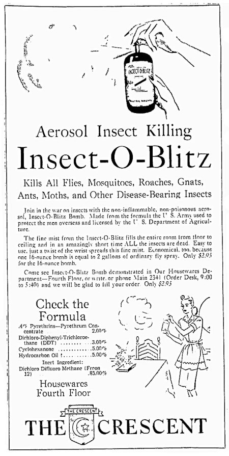 En la imagen número 1, se puede ver un anuncio aparecido en diciembre de 1945 en la revista Chain Store Age, la cual estaba dirigida a ejecutivos de empresas de distribución. En este anuncio se adelanta que pronto llegará una gran campaña publicitaria a nivel national: «big national advertising campaign soon to be released». El envase de aerosol nació para desbancar al pulverizador de émbolo. La principal ventaja era su facilidad de aplicación y su economía. El insecticida salía empujado por un gas propelente que permitía en pocos segundos dispersar de forma bastante homogénea la sustancia activa. Insect-O-Blitz fue formulado para que su aplicación tuviera un efecto de choque. Por esta razón, junto al DDT fueron añadidas piretrinas. Dejo apuntado que en 1948 fue sintetizada la aletrina, el primer piretroide [3].