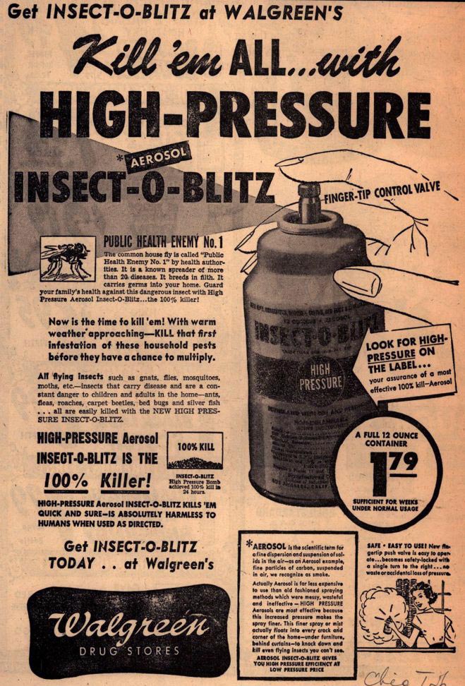 En la imagen número 1, se puede ver un anuncio aparecido en diciembre de 1945 en la revista Chain Store Age, la cual estaba dirigida a ejecutivos de empresas de distribución. En este anuncio se adelanta que pronto llegará una gran campaña publicitaria a nivel national: «big national advertising campaign soon to be released». El envase de aerosol nació para desbancar al pulverizador de émbolo. La principal ventaja era su facilidad de aplicación y su economía. El insecticida salía empujado por un gas propelente que permitía en pocos segundos dispersar de forma bastante homogénea la sustancia activa. Insect-O-Blitz fue formulado para que su aplicación tuviera un efecto de choque. Por esta razón, junto al DDT fueron añadidas piretrinas. Dejo apuntado que en 1948 fue sintetizada la aletrina, el primer piretroide [3].