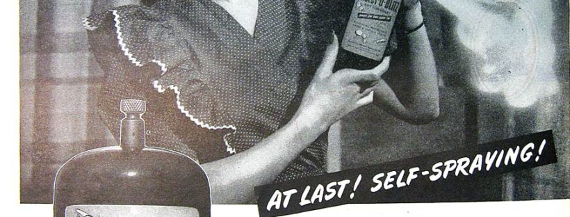 Para acabar, tenemos un anuncio de 1950. El envase nada tiene que ver con los anteriores. Las diferencias son dos. Primero, que el bote es desechable. A diferencia de los primeros que eran reutilizables. Y segundo, que disponía de una válvula automática de dosificación. Al dejar de oprimir la válvula, esta dejaba de expulsar producto. Este fue un paso importante, ya que los primeros botes de espray disponían de un tornillo que había que desenroscar para dejar escapar el insecticida.