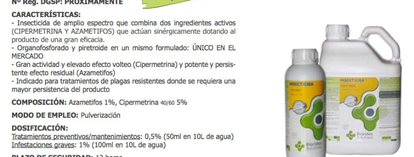 Gracias a Biocides Solutions SL tenemos una materia activa más en el abanico de posibilidades insecticidas [1]. Comercializa un producto interesante llamado Exit Max con azametifós al 1 % y cipermetrina 40/60 al 5 % [2]. En estos momentos, es el único producto para uso profesional especializado que contiene azametifós, materia activa de la familia de los organofosforados [3]. Y es además el único compuesto representante de esta familia incluido en el Anexo I del Reglamento (UE) 528/2012 relativo a la comercialización y el uso de los biocidas. Esto se debe a que la empresa Belgagri SA de Bélgica defendió su inclusión para uso como insecticida (TP18). Recordemos que compuestos de esta familia usados ampliamente años atrás como el clorpirifós y el diazinón quedaron excluidos de Anexo I.