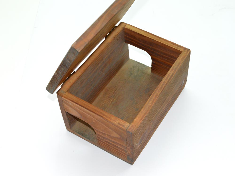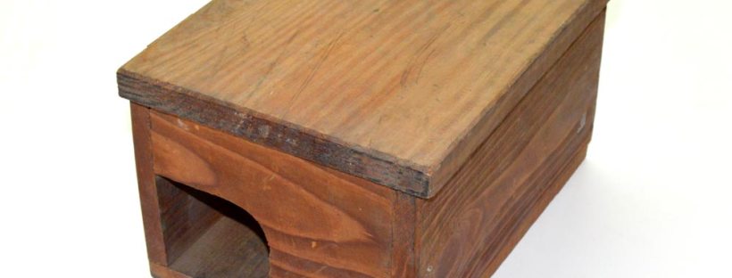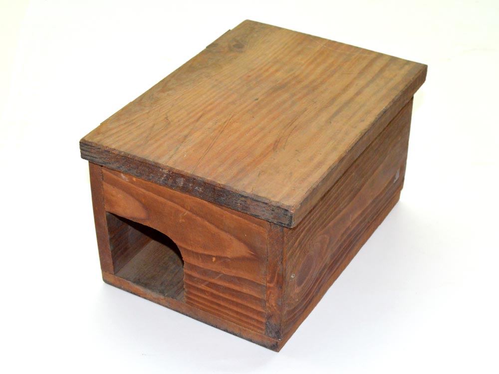 Este es uno de los cebaderos más bonitos que he visto. Es de madera, robusto y de tamaño medio. Cuando lo vi por primera vez, me pareció una caja-nido para pájaros. Lo llevó a la oficina un compañero que lo encontró en una subestación eléctrica. A saber cuánto tiempo hacía que estaba allí. Las medidas son 21 x 15 x 11’5 centímetros. La madera tiene un grosor de entre 12 y 13 milímetros.