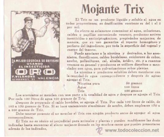 La principal marca de insecticidas que tiene esta empresa en la actualidad es Oro Matón, la cual puede que sea la más antigua. En la imagen número 1, se puede ver un pulverizador de émbolo con el nombre de la marca que he encontrado a la venta en la página Todocolección. Por el momento tan solo he encontrado este insecticida. No sé qué materias activas debía llevar. Seguramente, por la época, tendría DDT o lindano.
