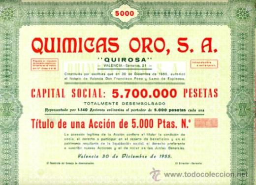 Fue constituida el 30 de diciembre de 1955 por el químico Francisco Vilanova Ibáñez, el cual ya debía tener experiencia fabricando insecticidas bajo el nombre comercial de Oro (figura 4). Parece ser que era certificador oficial de la calidad del oro. Y es por ello que usó el nombre del metal precioso para sus marcas y le puso el nombre de Químicas Oro SA a la empresa nacida en 1955. Al principio, en los productos aparecía abreviado el nombre de la sociedad anónima como QUIROSA en sus productos. El capital social constaba de 5.7000.000 pesetas, repartido en acciones de 5.000 pesetas.