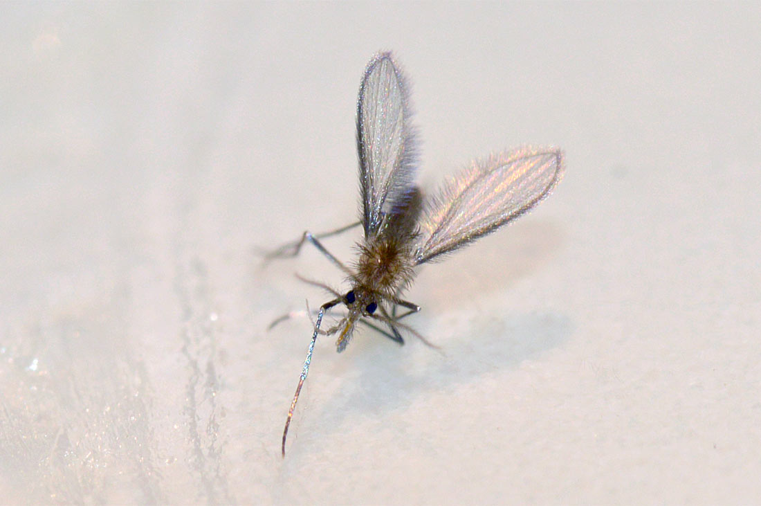 Desde hace algunos días se está colando algún flebotomo en casa. El primero que detecté fue mientras cenábamos. Vi algo que volaba cerca de mi mujer, pero no le di importancia. Minutos más tarde, mi mujer vio sobre su antebrazo un pequeño insecto de color claro. Al poco tiempo le apareció una inflamación. Entonces me di cuenta de que era un flebotomo. Le comenté a mi mujer que si volvía a ver algo parecido que me avisara. Al día siguiente, notó que se le posaba un flebótomo y me llamó. Rápidamente cogí un potecito y fui a cazarlo. Bien. Para poderle hacer una foto puse como tapa un cartón encolado y esperé a que se posara sobre este. Cuando quedó atrapado le hice unas cuantas fotos. Espero que se pueda apreciar bien su forma, ya que mide poco más de 2 milímetros.