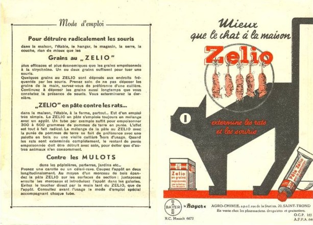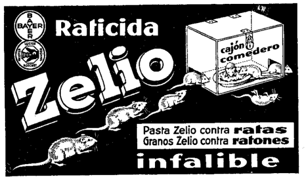 Hacia 1923, la casa Bayer patentó el uso de sulfato de talio (Tl2SO4) como raticida. Poco después, fue comercializado en Alemania un producto raticida con este compuesto bajo el nombre comercial de Zelio. Este nuevo producto pronto se exportó y fue vendido en aquellos países donde Bayer tenía presencia comercial. He encontrado datos de su venta en otros países de Europa como Austria, Italia, Francia o España. Y también por toda América como Estados Unidos, Costa Rica, Argentina, Uruguay, Brasil.