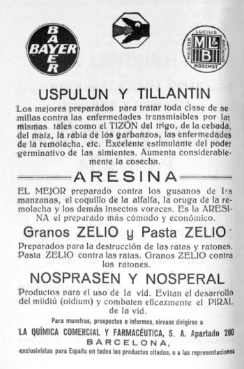 El anuncio más antiguo que he encontrado en España es de 1927 publicado en un libro escrito por José Mañanes Paino titulado ‘Los abonos’ (figura 2) [1]. Y en América, es un anuncio similar publicado en 1926 en Costa Rica en el ‘Boletín de Fomento’ (figura 3) [2].