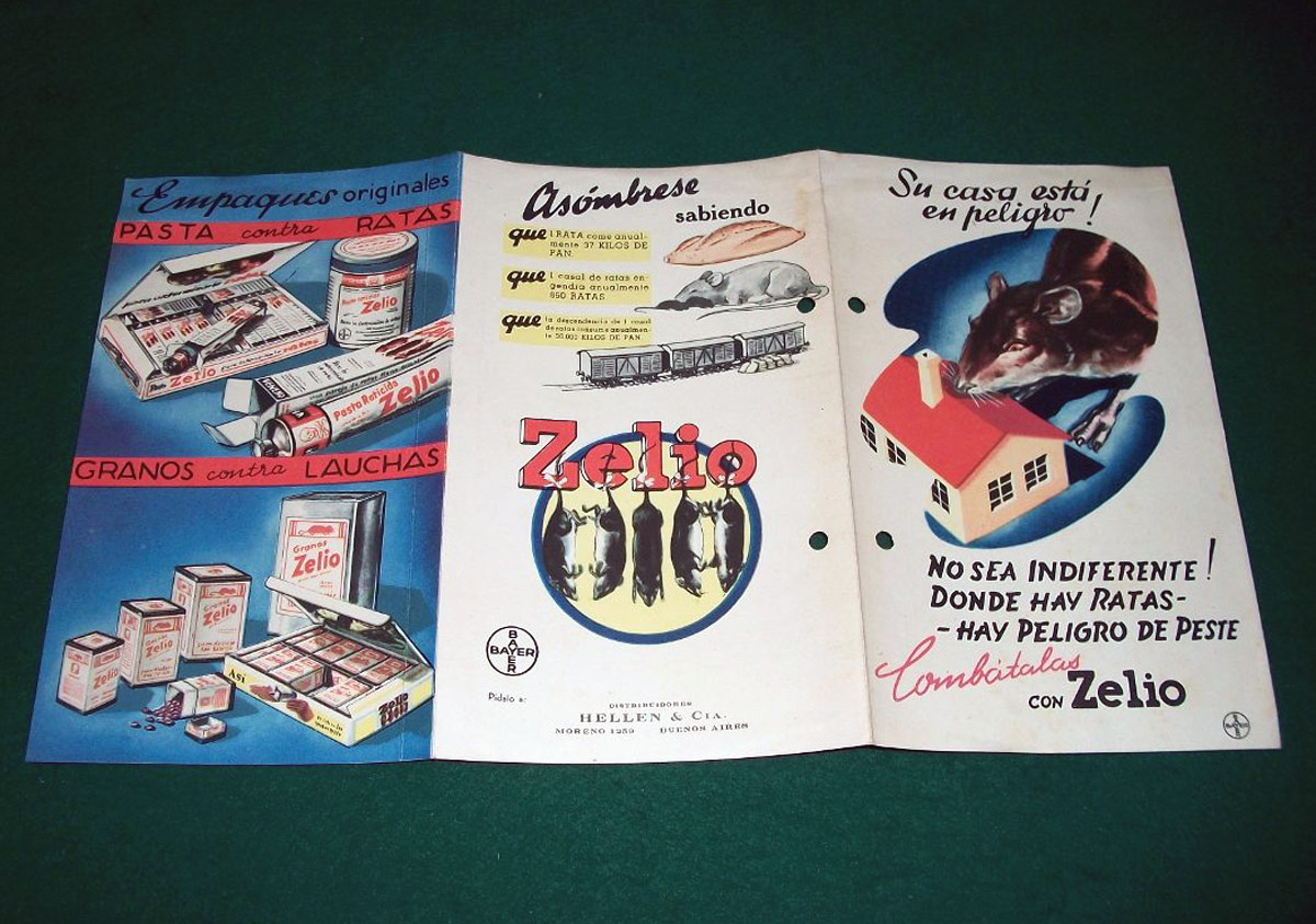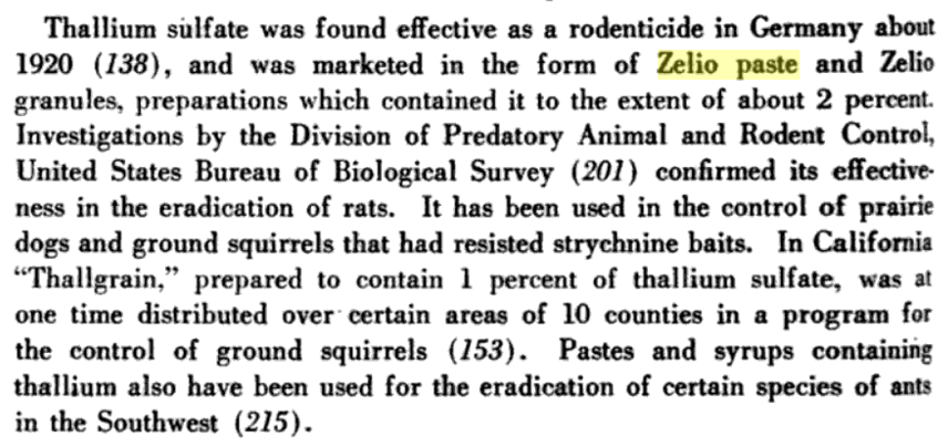 Hacia 1923, la casa Bayer patentó el uso de sulfato de talio (Tl2SO4) como raticida. Poco después, fue comercializado en Alemania un producto raticida con este compuesto bajo el nombre comercial de Zelio. Este nuevo producto pronto se exportó y fue vendido en aquellos países donde Bayer tenía presencia comercial. He encontrado datos de su venta en otros países de Europa como Austria, Italia, Francia o España. Y también por toda América como Estados Unidos, Costa Rica, Argentina, Uruguay, Brasil.