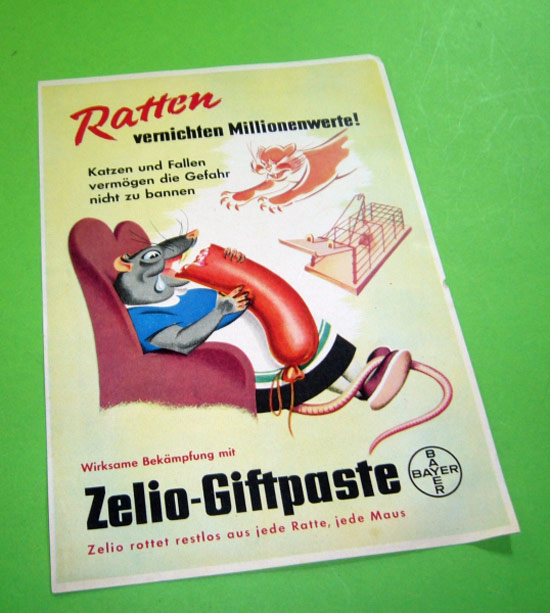 En las imágenes 1 y 4, se pueden ver elementos publicitarios interesantes, una octavilla publicitaria y un cartel metálico para colocar en establecimientos de venta al público. Es interesante destacar el logotipo, por así llamarlo, que creó Bayer para este producto, porque remite a los antiguos cazadores de ratas que colgaban de un palo las capturas del día. Tiempo atrás publiqué una entrada dedicada a antiguas estampas del oficio de desratizador [3]. El palo con ratas colgando era un reclamo publicitario y un estandarte de la misma manera que los caballeros llevaban sus pendones.
