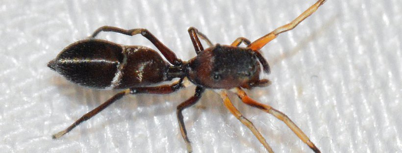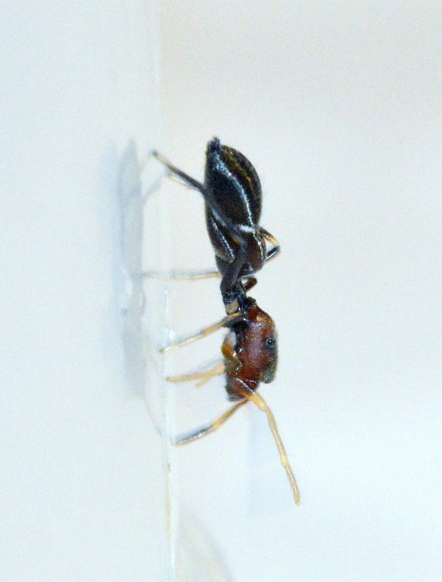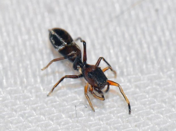Los saltícidos son arañas para mí especiales. Yo las catalogaría como más listas que la mayoría de arañas. Se las apañan bien sin necesidad de tejer telarañas. Y desde luego, las arañas hormigas son muy listas. Porque no se parecen tan solo en su aspecto a las hormigas, sino también en su comportamiento. Las dos patas delanteras las mueven como si se tratara de antenas. En la imagen número 3 se pueden ver las dos patas levantadas. Si uno observa esta araña de lejos, la confundirá con una hormiga. En el aspecto destaco el estrechamiento del abdomen a modo de peciolo y la forma cuadrada de la cabeza en cuyos laterales tiene lo que parecen dos ojos. Está claro que este parecido con las arañas es porque en su dieta están hormigas.