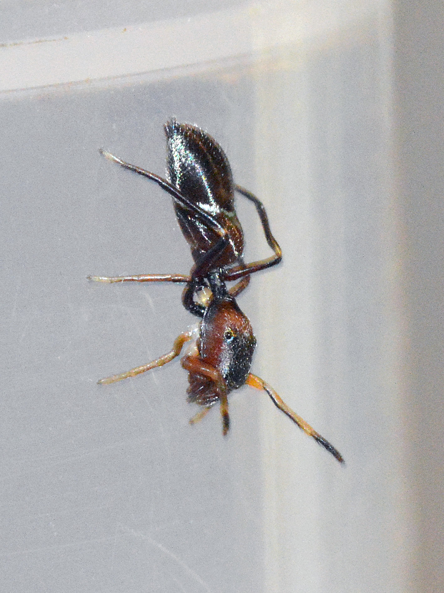 Esta mañana me he encontrado en el interior de una casa un araña muy interesante. Estaba yo intentando descubrir de dónde venían unas hormigas Lasius cuando he visto correr una un poco más grande de lo normal. Mi vista la ha seguido y detrás ha ido mi mano para cogerla. Cuando la he tenido delante de los ojos me he dado cuenta de que no era una hormiga, sino una araña. Existen tres géneros de arañas de la familia Salticidae que guardan un parecido asombroso con las hormigas. Estos son: Synageles, Leptorchestes y Myramarachne. En las fotografías se puede ver una araña del género Leptorchestes. Probablemente se trate de una Leptorchestes peresi. Medía unos 6 milímetros.