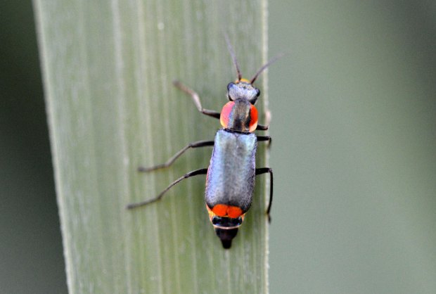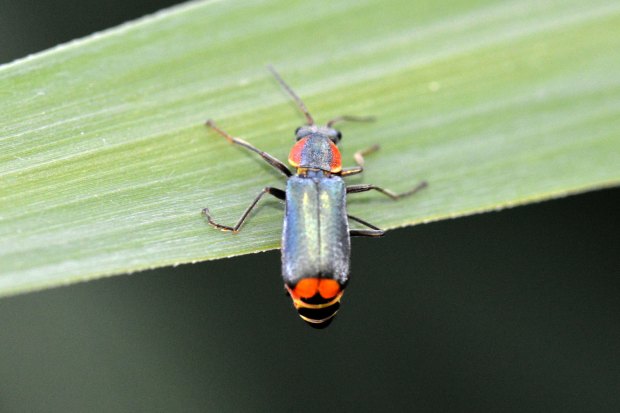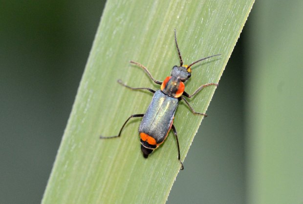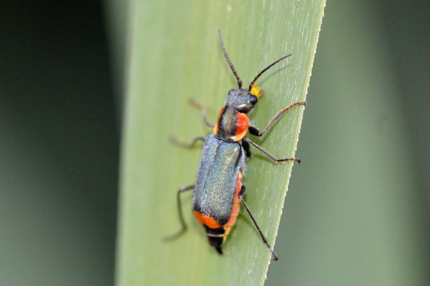 Encontré sobre una hoja de caña americana un individuo adulto de maláquido (Malachiinae). Los escarabajos de esta subfamilia de los melíridos (Melyridae) tienen un aspecto particular. Son, por lo general, de color oscuro con bandas y manchas amarillas o encarnadas. En las imágenes se puede ver un individuo del género Axinotarsus. Desconozco a qué especie pertenece. Tomé las fotografías cerca de la orilla del río Besós a la altura de Montcada i Reixac, Barcelona.