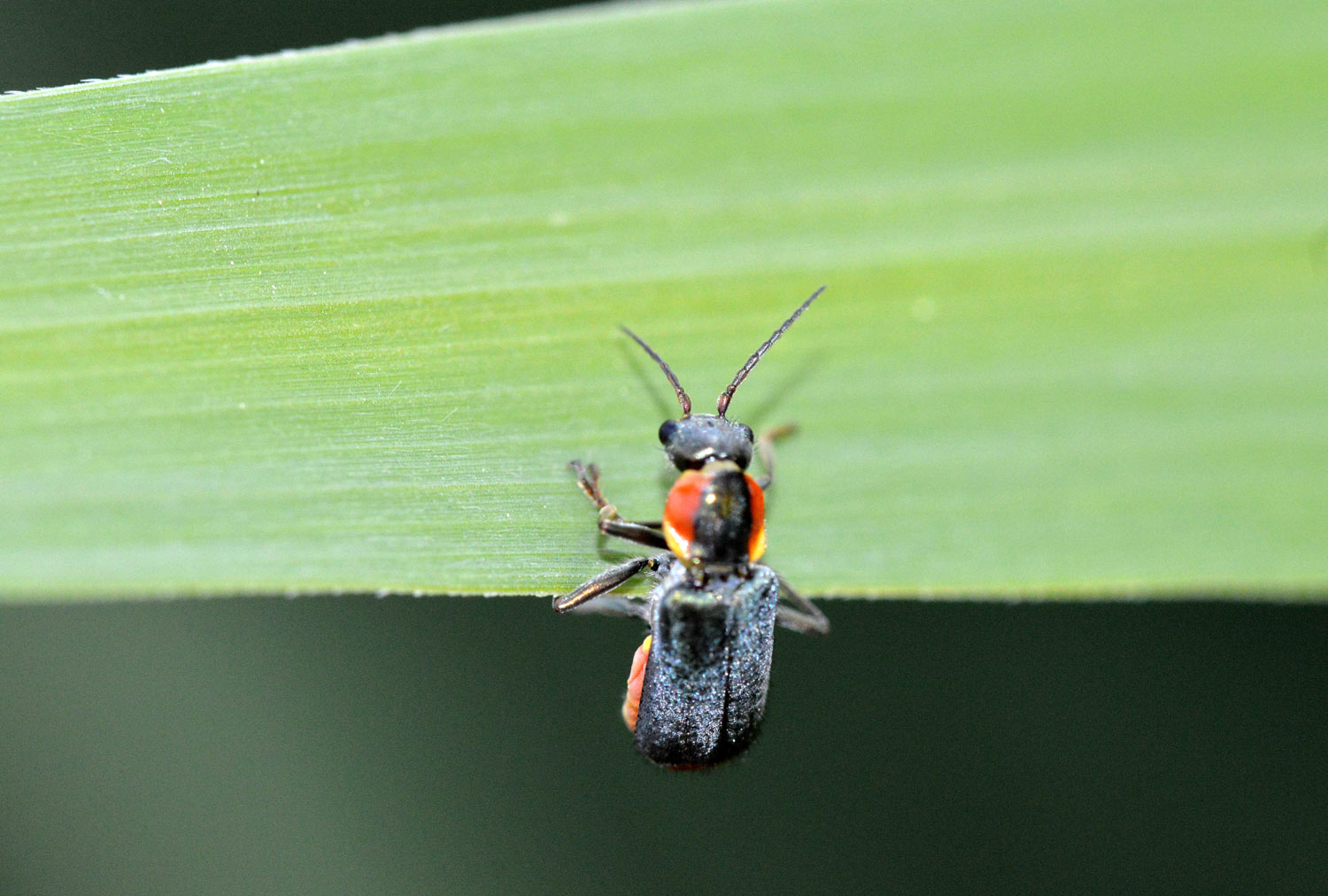 Encontré sobre una hoja de caña americana un individuo adulto de maláquido (Malachiinae). Los escarabajos de esta subfamilia de los melíridos (Melyridae) tienen un aspecto particular. Son, por lo general, de color oscuro con bandas y manchas amarillas o encarnadas. En las imágenes se puede ver un individuo del género Axinotarsus. Desconozco a qué especie pertenece. Tomé las fotografías cerca de la orilla del río Besós a la altura de Montcada i Reixac, Barcelona.