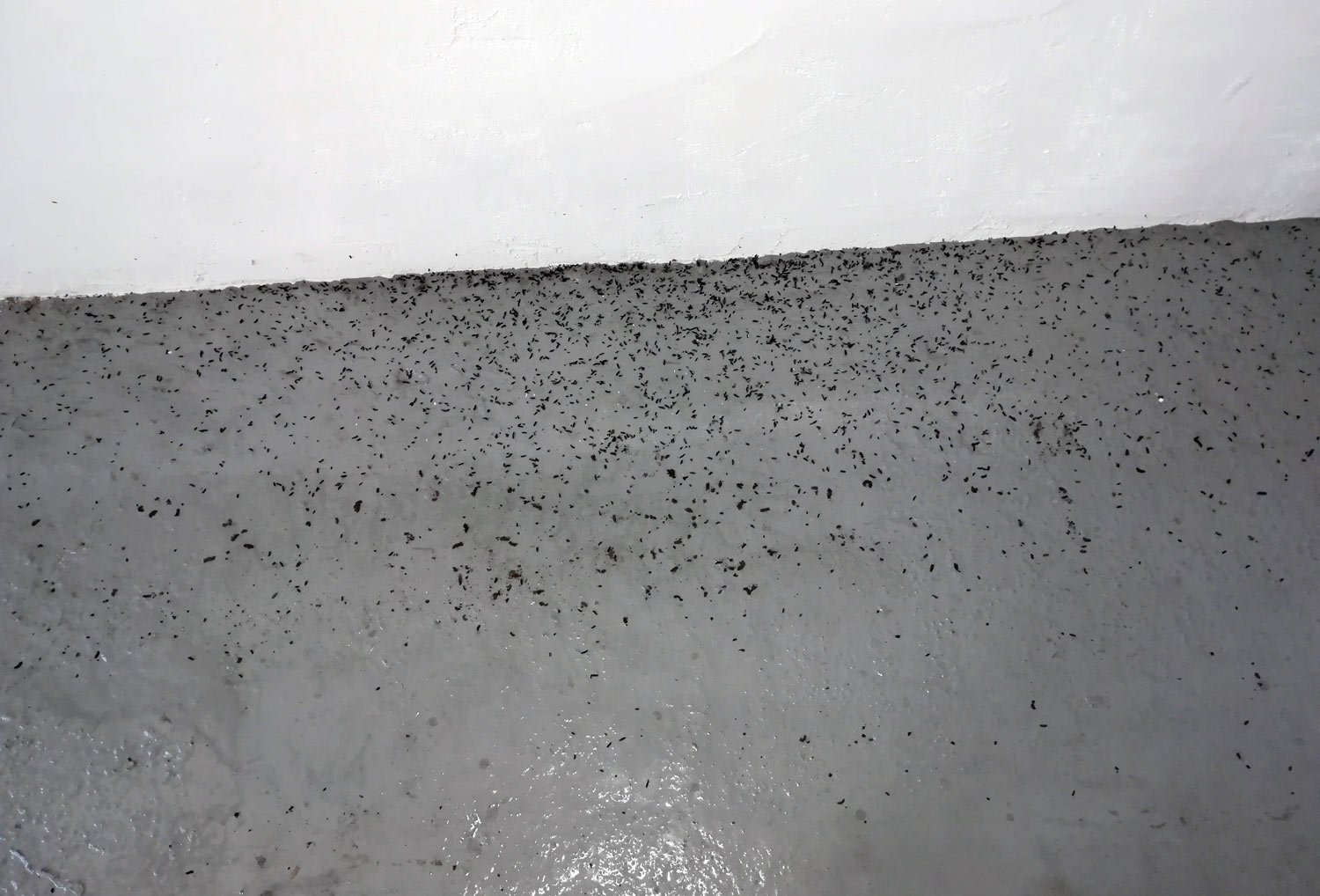 Fig 6. Excrementos de murciélago en el suelo de una nave industrial./ C. Pradera 05-2019